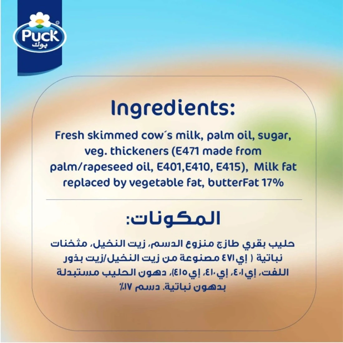 Puck Low-Fat Half Sterilized Cream is a high-quality dairy product that offers a lower-fat option for those looking to maintain a healthier lifestyle. Made from fresh cow's milk, this cream has been partially sterilized to ensure long shelf life without the need for refrigeration until opening. With a smooth and creamy texture, it can be used for various culinary purposes like whipping, cooking, or as a complement to desserts and beverages. Puck Low-Fat Half Sterilized Cream is the perfect choice for those seeking a lighter alternative without compromising on taste and versatility.