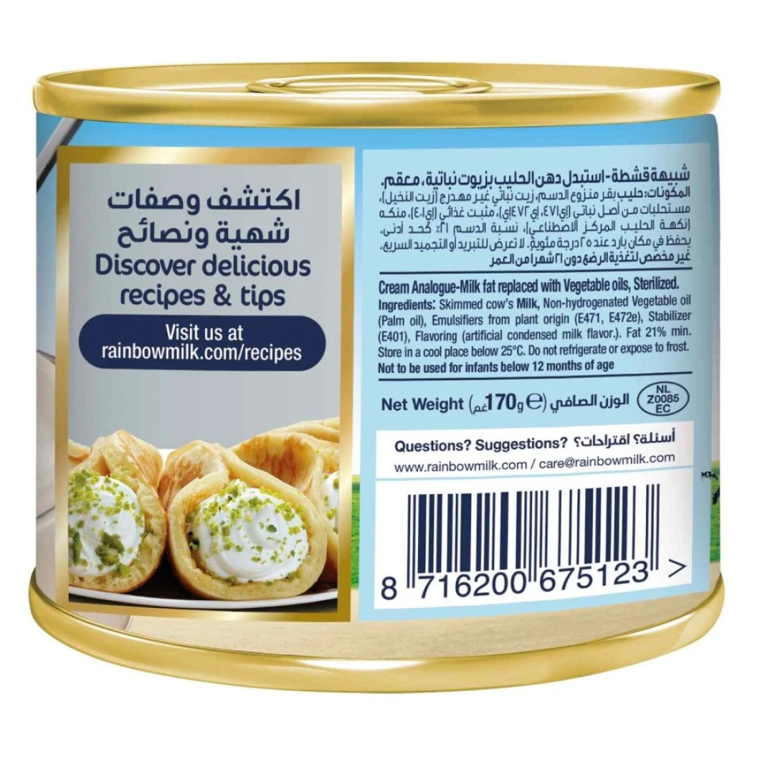 Rainbow Sterilized Cream is a 170g container of high-quality sterilized cream. Made from fresh cow's milk, this cream is pasteurized and processed to ensure optimal purity and freshness. It has a smooth and creamy texture, making it perfect for a variety of uses in cooking and baking. Whether you're making desserts, sauces, or simply adding a delicious richness to your favorite dishes, Rainbow Sterilized Cream is a versatile and essential ingredient in any kitchen. Its long shelf life and convenient packaging make it a great pantry staple for any home cook or professional chef.