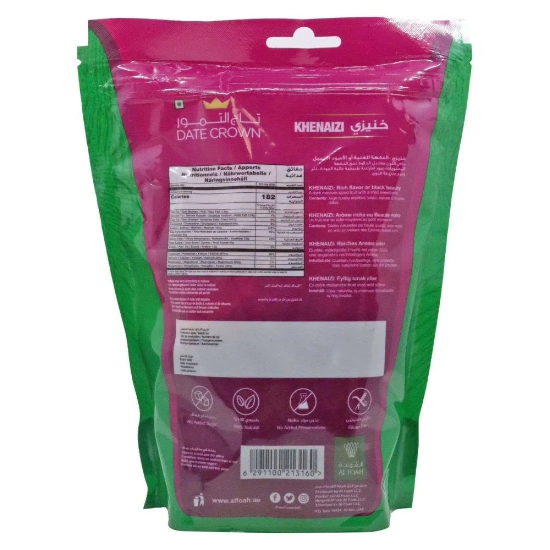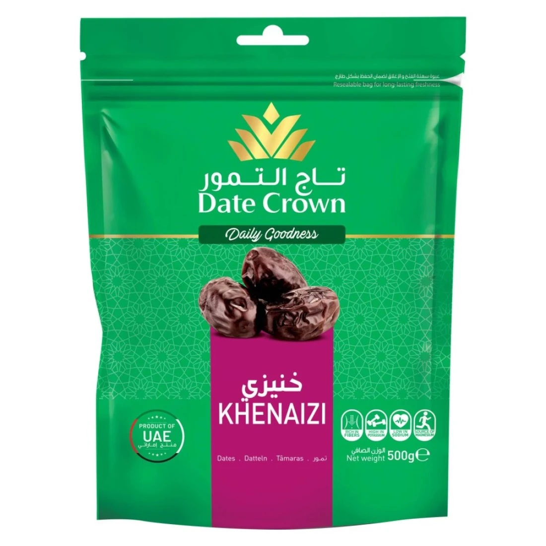 Date crown Khenaizi dates are attractively black, mildly sweet and mixed with a pleasant rich flavour. The medium size fruits which are grown across the UAE regions. They are also soft and highly sweet and slightly different in taste from Khalas. They have high demand due to their distinctive dark colour and juicy texture. Khenaizi dates are a key element of the ancient Arabic lifestyle and civilization. Date Crown Khenaizi Dates are the finest emirates dates. Date Crown is one of the top-performing date brands in international markets since 2005. The brand is currently exported to more than 33 countries across the world.