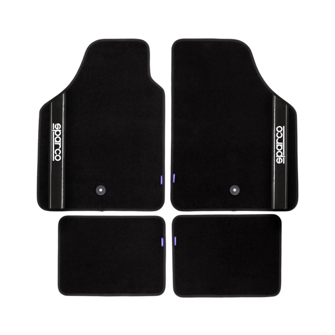 Material: Polyester + PVC backing. Front: 650 x 470 mm / Rear: 300 x 400 mm. Weight: 2 kg. Durable and aesthetic. Non-skid backing for a better drive and greater comfort. Sparco logo detail. Front mats with a hole for screw insertion blocks rug. 450g/sqm good quality carpet. Set includes 2 front mats & 3 rear mats. Universal sizes. Sparco Header Card package.