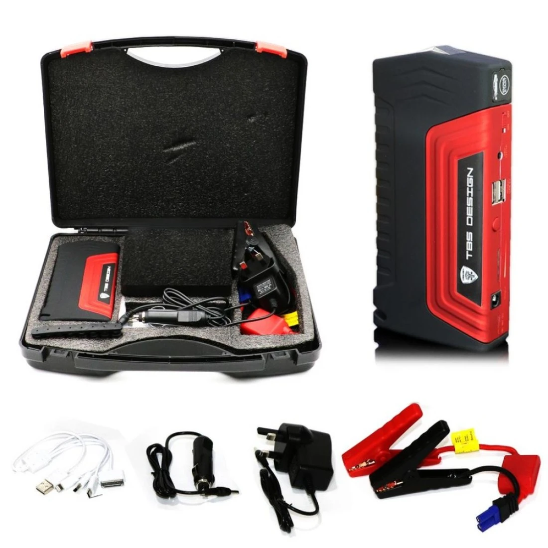 1 x Jumpstarter, 1 x 220V Home charger, 1 x 12V Car Charger, 1 x Battery Plug clips