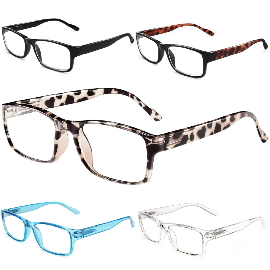 DESIGNED FOR READING: Eyeglasses for women that help people who have difficulty reading small print or seeing objects up close. Reading glasses are also called readers or cheaters, A VARIETY OF DIOPTERS: Readers for women are typically available in a variety of strengths, or diopters, which is the amount of magnification provided by the lenses, ANTI BLUE LIGHT GLASSES: Upgrade your screen time with this stylish 5-pack of blue light reading glasses for women. With these eye glasses for every place you relax, you can protect your eyes and maintain a polished look wherever you go., SPRING HINGES: Womens reading glasses also have features such as spring hinges that make them comfortable to wear for long periods of time, STYLISH FRAME: Reading glasses for women are often designed with stylish frames and colors that appeal to women's tastes