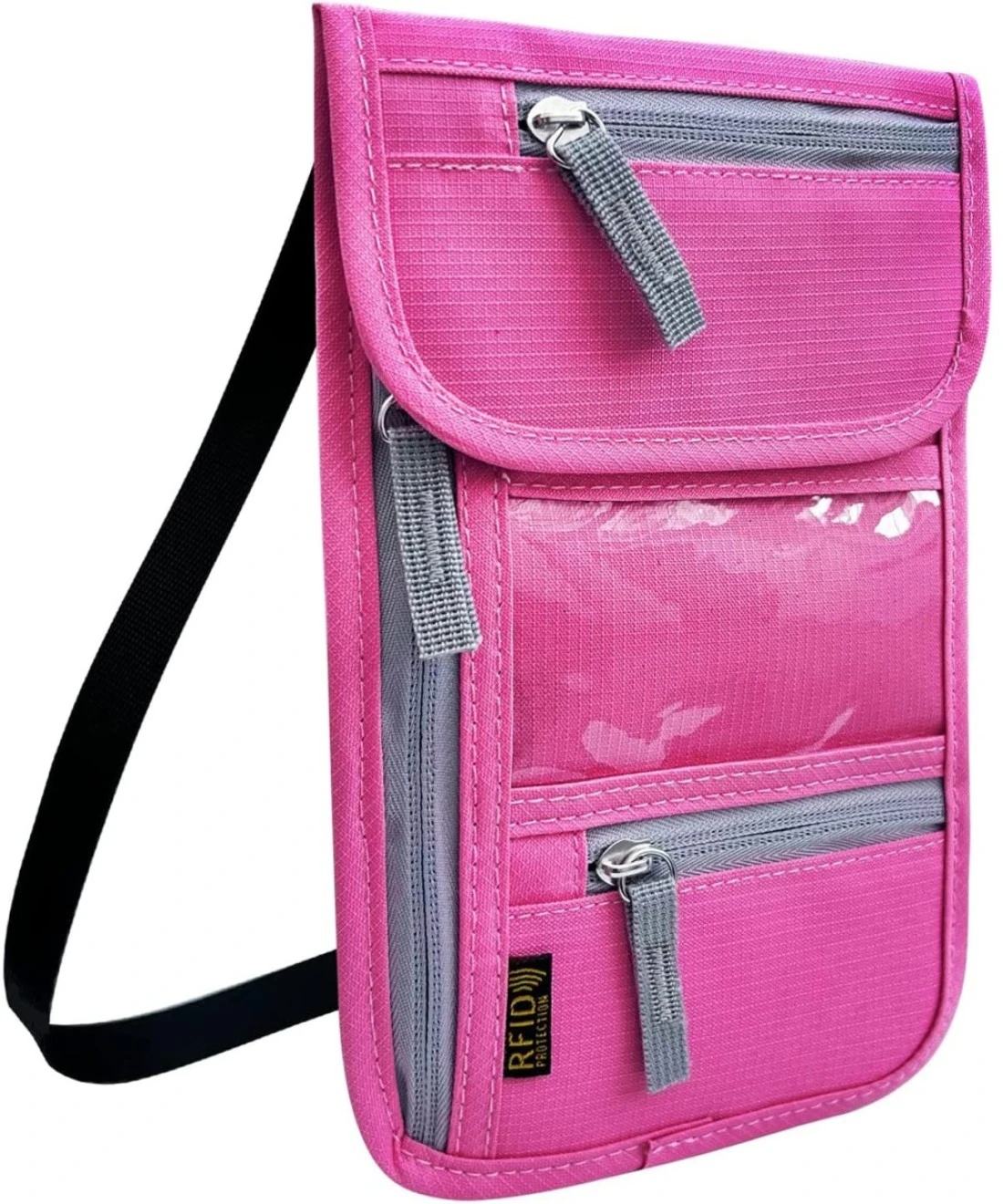 RFID Blocking Design- Travel wallet lined with radio frequency shielding material provides complete protection against scanning your important personal data, protecting your card and personal information from pickpockets., Premium Materials - The passport neck pouch is made of durable and lightweight nylon that is tear-proof, sweat-proof, and anti-scratch. The back is made of a soft and breathable padded mesh that is very comfortable to wear and keeps the body dry., Flexible Storage - Designed with 3 concealed zipped compartments, 1 Velcro closure patch and 1 ID window for a transparent boarding pass, this travel wallet makes security checks easier and organizes your documents and valuables., Large Capacity Travel Bag - This Passport Pouch comes with a detachable shoulder strap, multiple compartments and zip pockets to protect your CDC vaccination cards, credit cards, passports, airline tickets, smartphones, cash and more from loss to keep your bag organized., Slim and lightweight - This secure passport clip is 5.9 inches wide and 9 inches high, slim enough. This travel wallet includes a soft and adjustable neckband that adjusts from 15 inches to 55 inches according to your needs. Hanging around the neck or hidden under clothes does not add unnecessary volume, providing comfort and convenience.