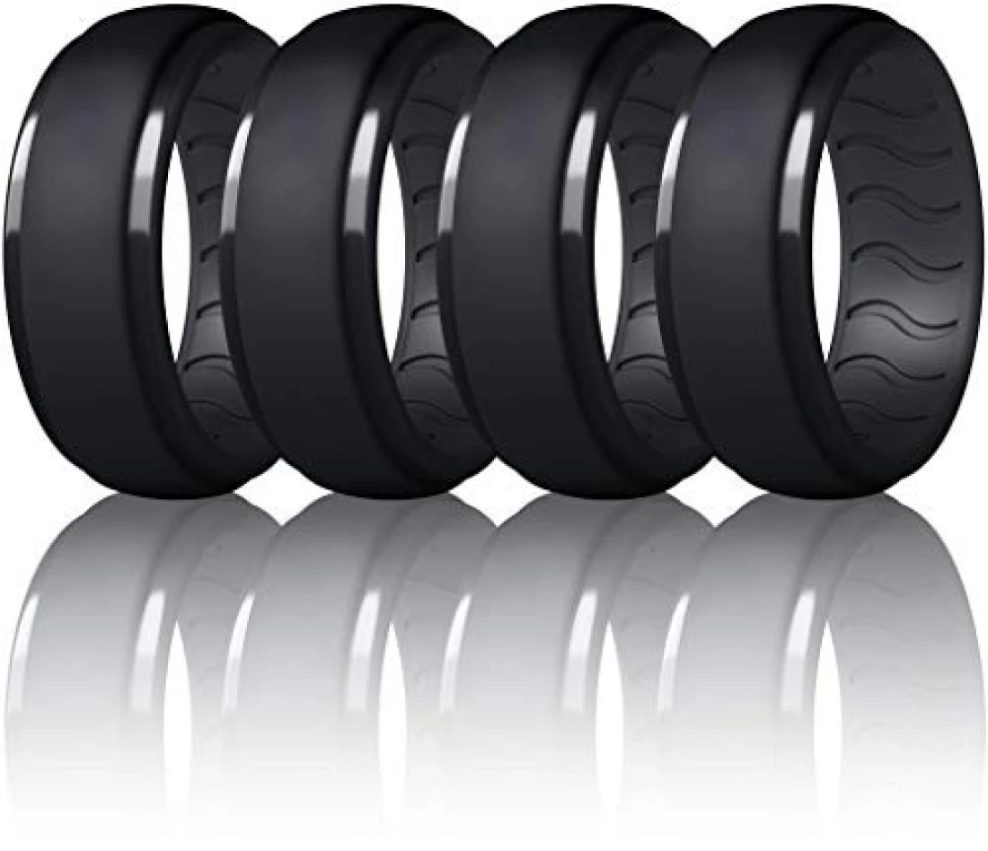Dookeh Breathable Silicone Wedding Rings for Men - Skin Safe Mens Rubber Wedding Bands - Improved Design for Crossfit Workout Swimming Firefighters Military (All Black, Size 10)