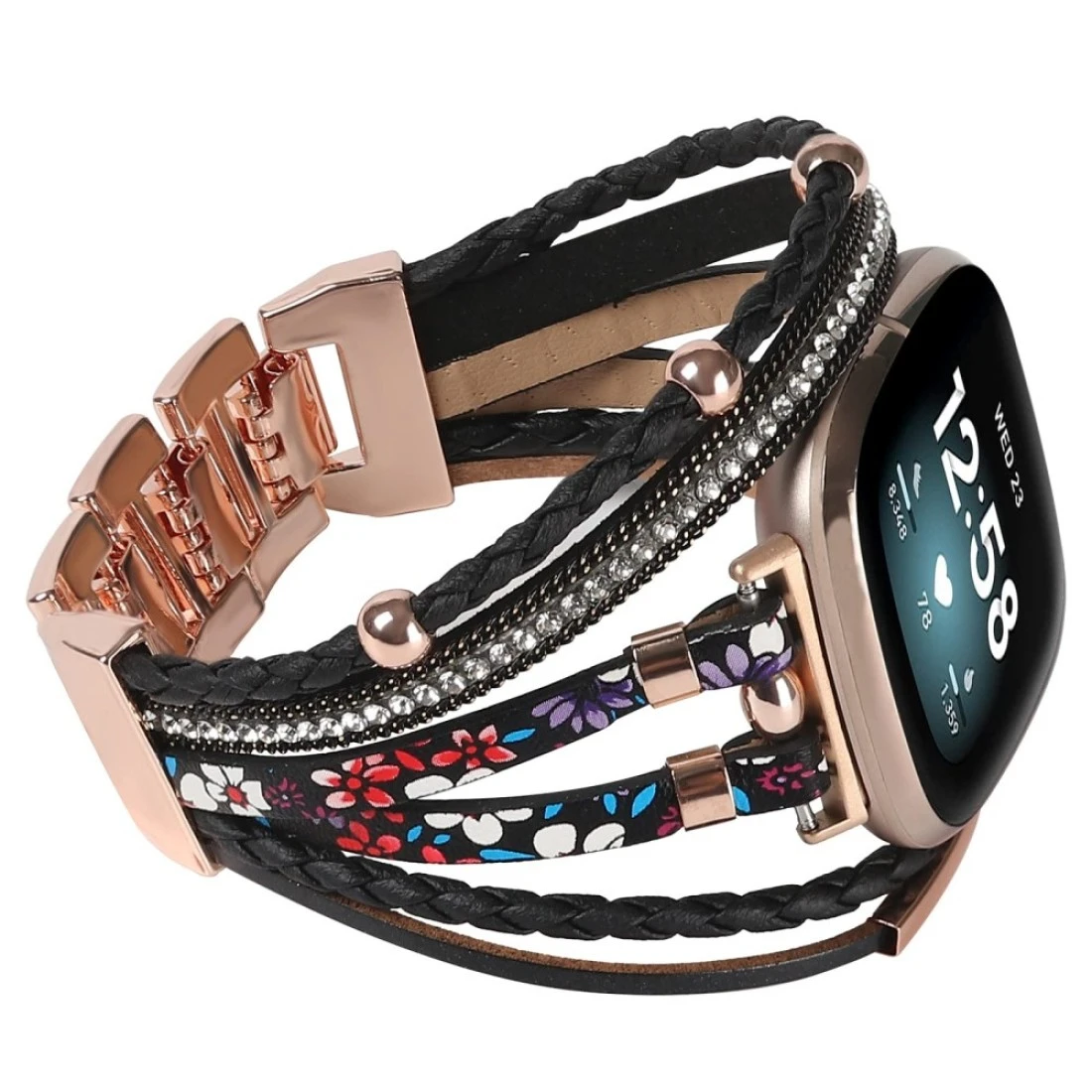 Posh Leather Bands Compatible with Fitbit Versa 3/Fitbit Sense, Women Boho Stylish Multilayer Wrap Bracelets Wristband, Handmade Adjustable Jewelry Strap for Sense/Versa 3 Smart Watch (Black Flower)