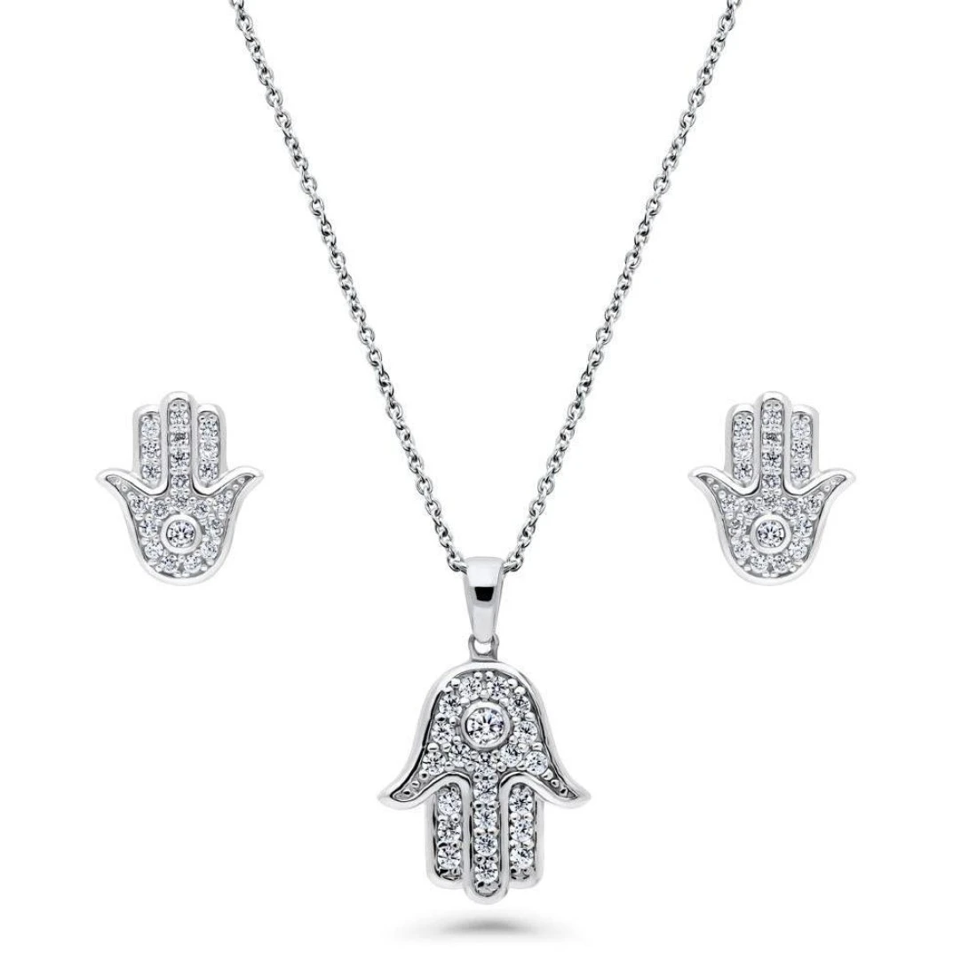 925 Sterling Silver: This hamsa hand earrings and pendant necklace set is crafted with fine solid sterling silver, stamped 925. Rhodium plated for enhanced durability and tarnish resistance., Nickel-Free: Designed with your comfort in mind, safe for sensitive skin, ensuring irritation-free wear., Earrings: Set with premium grade 0.46 ct.tw round cubic zirconia CZ (1.75mm - 1.25mm) in bezel and pave setting. Center posts with butterfly backs. Measures 0.5"(L), 0.43"(W)., Necklace: Set with premium grade 0.36 ct.tw round cubic zirconia CZ (2.25mm - 1.5mm) in bezel and pave setting. Chain measures 18" in length, 1mm in width. Lobster claw clasp. Pendant measures 0.83"(L), 0.53"(W)., Designed From NY: Berricle Zirconia is created in a way that truly replicates the cut, clarity and sparkle of a diamond. Beautifully packaged in a gift box. Perfect women jewelry gift for anniversary, birthday, Holidays.
