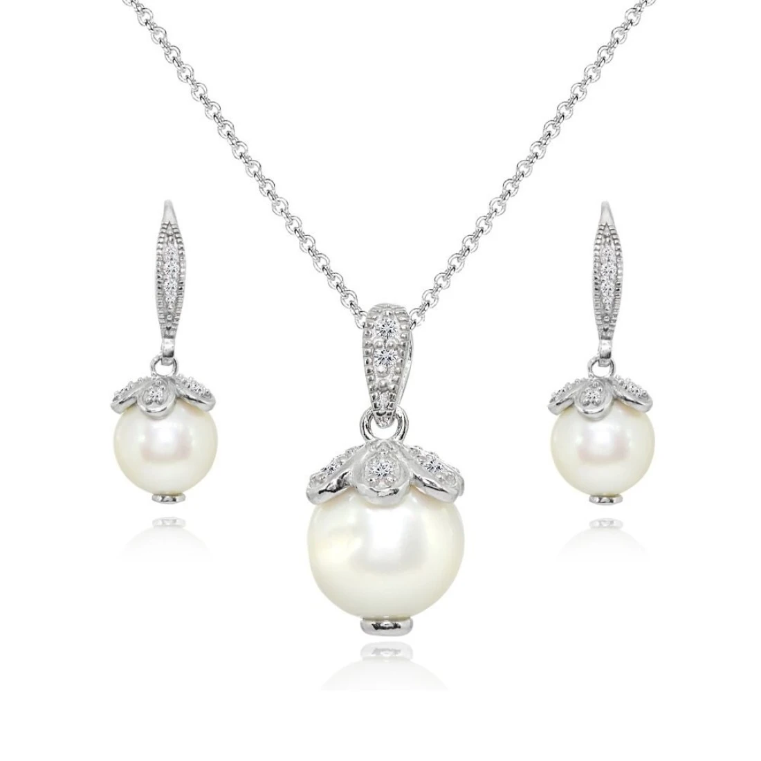 FEATURE - Wear this stylish pearl jewelry set to enhance your daytime and evening attire. This beautiful jewelry set includes leverback earrings with a matching necklace that features a 10mm simulated white pearl in a white topaz encrusted crown setting., CRAFTED - This stunning set is crafted of fine sterling silver, and is nickel & tarnish free. The necklace secures by a spring-ring clasp and measures 18 inches in length and 9mm in width and 18.5mm in height. The earrings secure by leverbacks and measure 9mm in width and 27mm in length. This necklace and earrings set in fine jewelry is a great addition to your pearl jewelry and topaz jewelry collection. It can be purchased as gifts for women., CARE - Keep from water cosmetics & chemical product. Clean with microfiber cloth, PACKAGING - Jewelry packaged with a nice box ready for gifting., ABOUT – We offer a variety of fine fashion gemstone CZ and fine metal jewelry