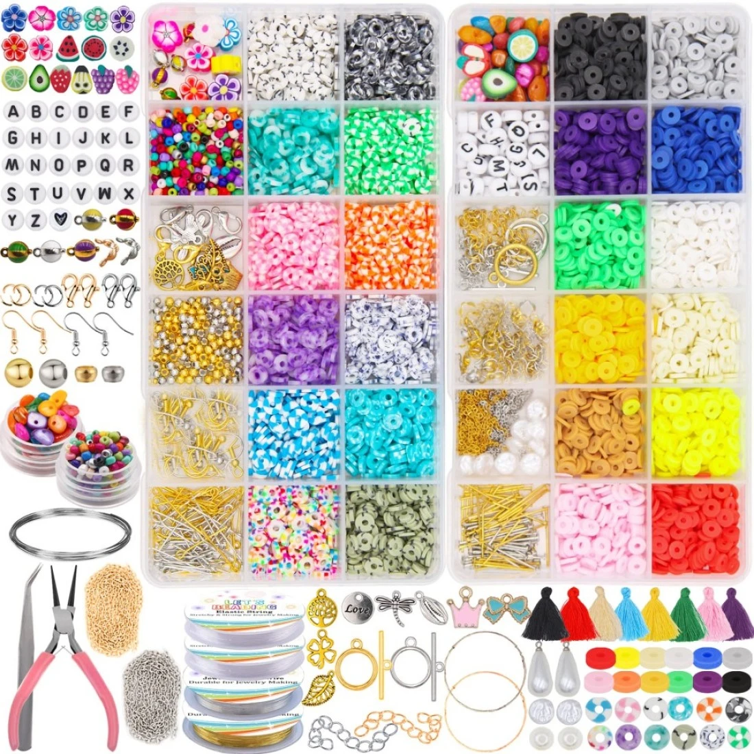 LETS BEADING Flat Round Clay Beads Kit with Pearl Beads Letter Beads Enamel Charms Fruit Beads Tassels Copper Wires Jewelry Findings for Bracelets Necklace Earring Jewelry Making Crafts