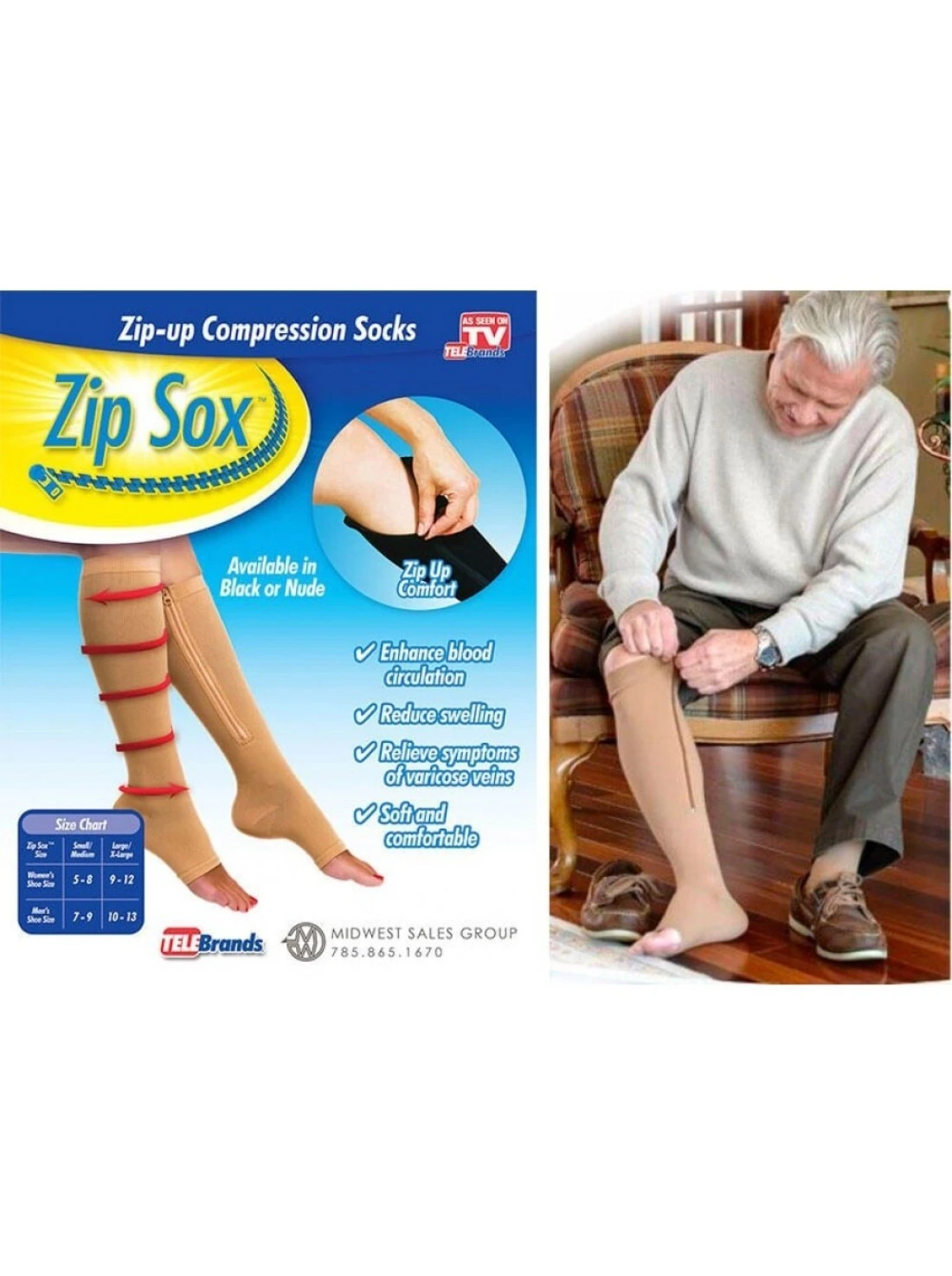 The revolutionary new zip-up compression socks relieve pain, swelling, and varicose veins! The pinch-resistant zipper makes Zip Sox a breeze to put on and take off. Made with a breathable nylon (90%) and spandex blend that allows them to be worn with any type of shoe. The soft and comfortable design fits every size foot. Knee-length.