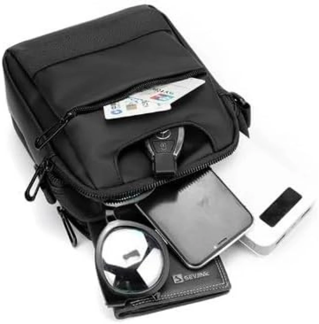 Bag has enough space to store your belongings, it has 6 compartments. 2 main compartments with zipper for books, clothes, documents and other items; 3 front pockets for pens, wallet, mobile phone, earphones; 1 back pocket for valuables in case stolen.
