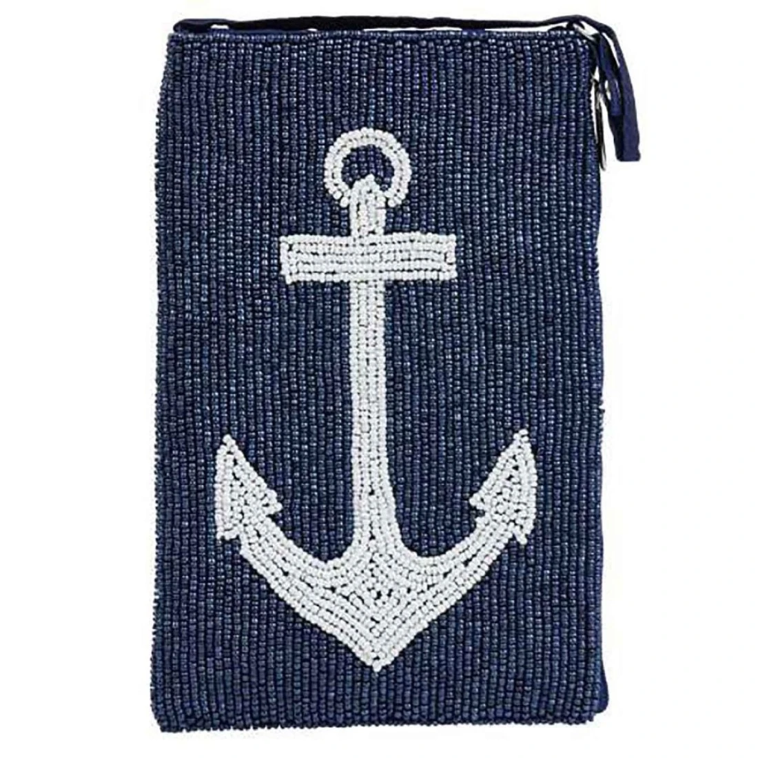 Nautical navy hue with a white anchor is shown on this hand made bag, Hand beaded by artisans in India, this versatile smart phone bag can be worn cross body or as a wristlet, Includes 54" cross body strap that can tuck inside when not in use, a short strap that unsnaps so the bag can be attached to a larger bag or belt, and a separate, secure side zip pocket for cash and credit cards, Size: 7.5 inches Width x 4.5 inches Height
