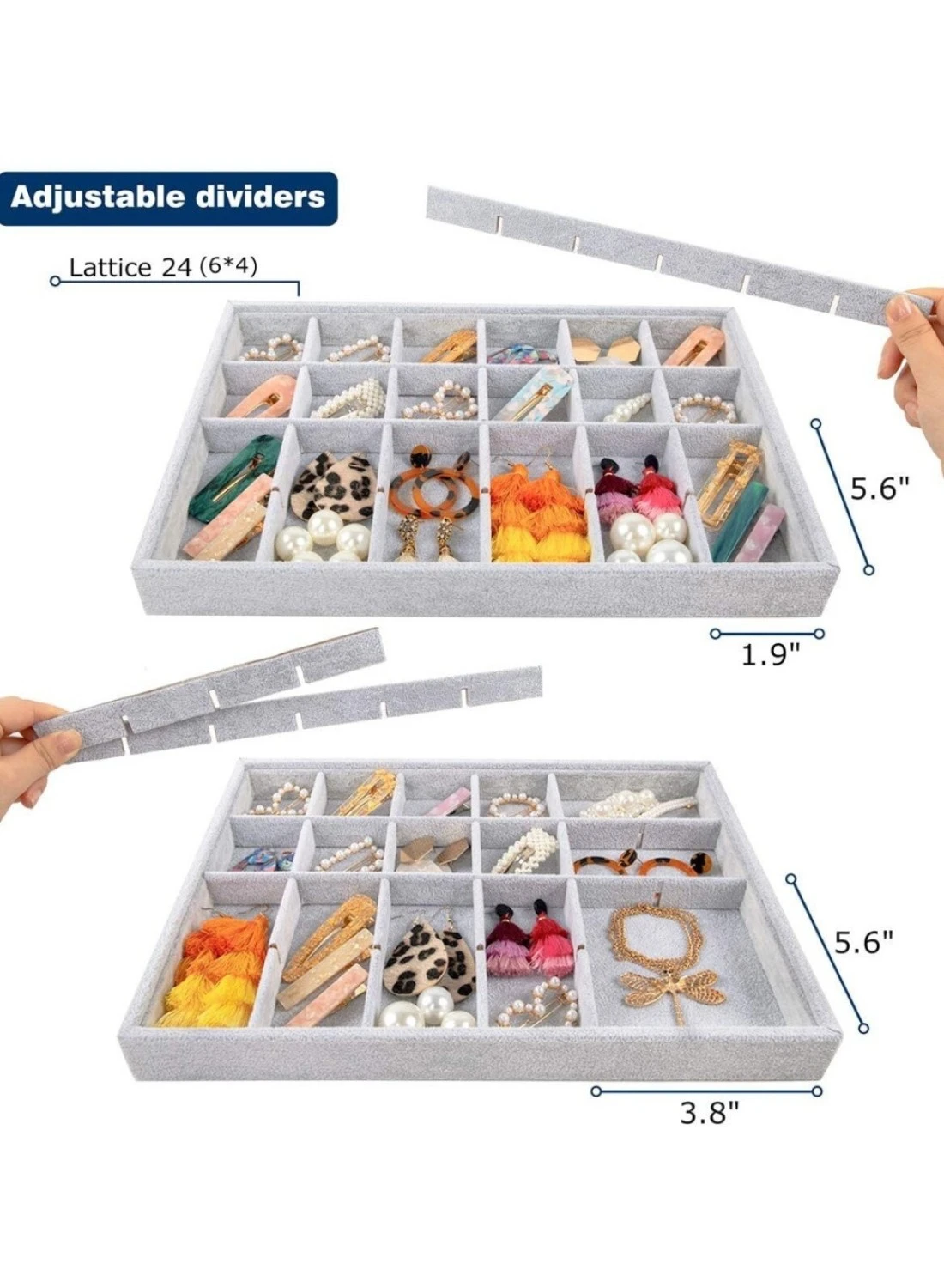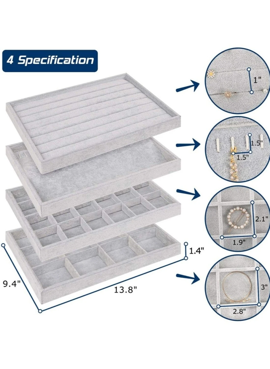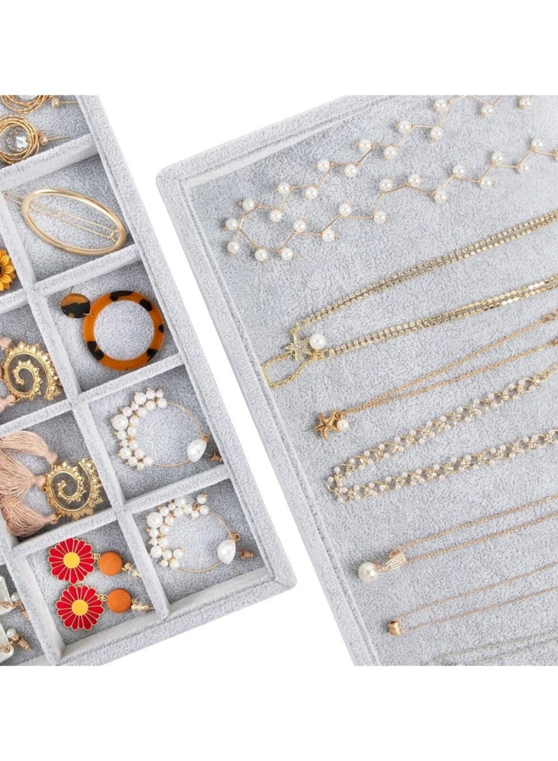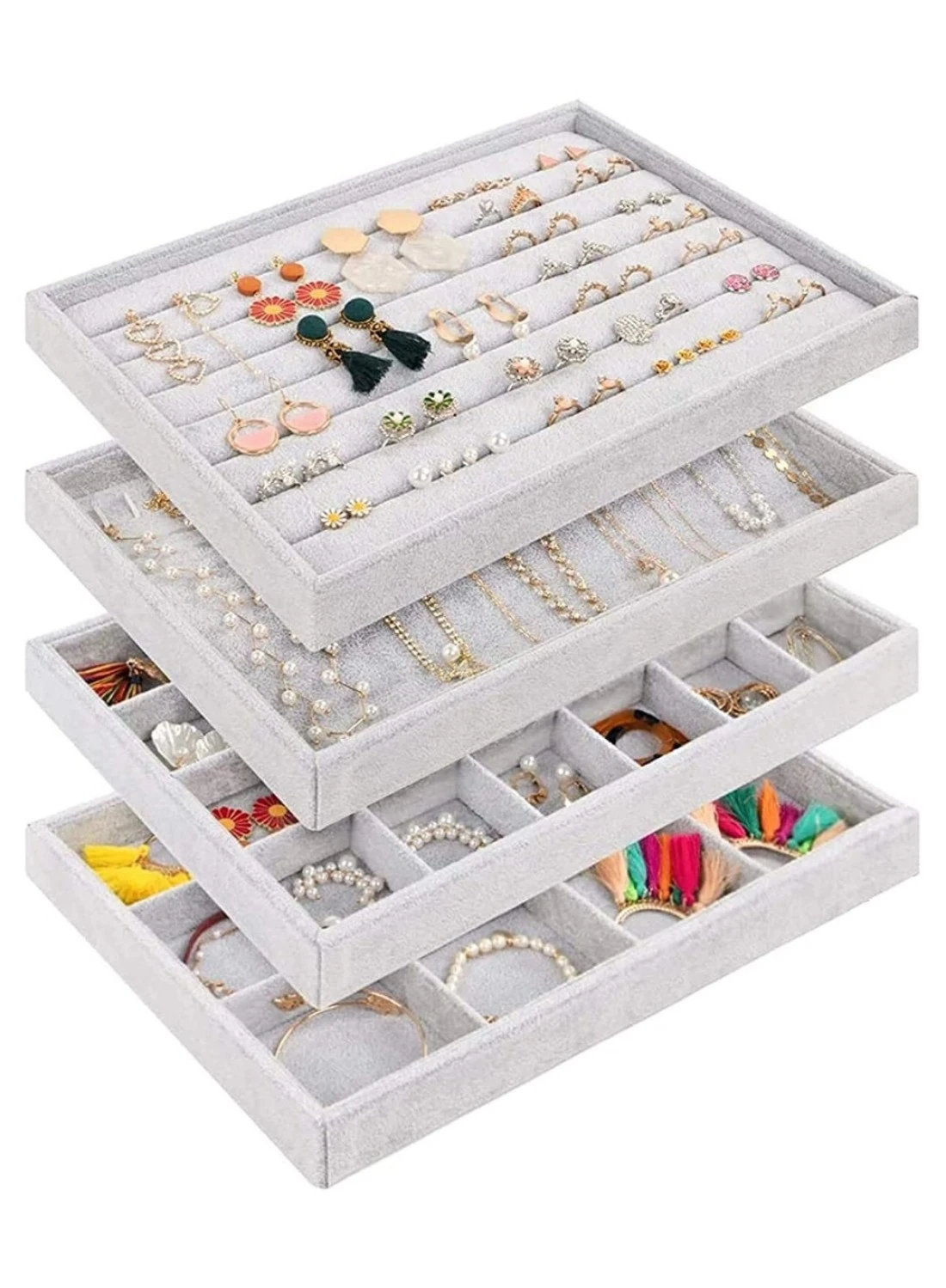 The set includes 24-Compartment Tray (1 pc) , 12-Compartment Tray (1 pc) , Rings Display Tray (1 pc) , Necklace Tray (1 pc) for earrings, rings, bracelets, necklaces.