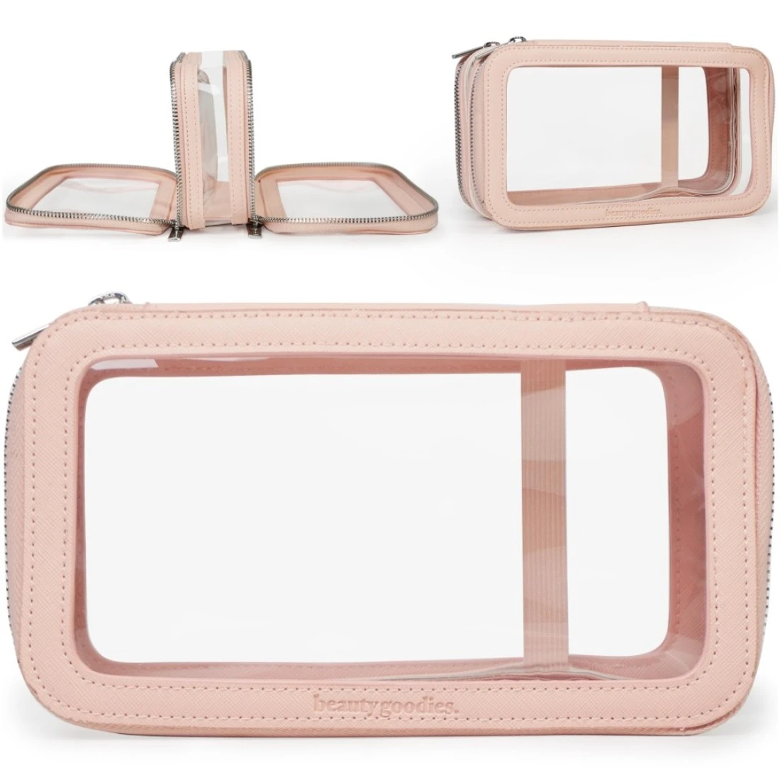 PREMIUM PINK BEAUTY ESSENTIAL: Transform your beauty routine with our pink transparent makeup bag, crafted from luxurious Saffiano vegan leather and durable thick vinyl. This clear makeup bag organizer maintains its elegant structure and longevity, featuring a dual-sided design with a dedicated brush compartment for optimal organization, RELIABLE AND SMOOTH ZIPPERS: Tired of dealing with faulty zippers? Our clear makeup bags for women boasts high-quality, smooth zippers that are built to last. Enjoy easy, reliable access to your essentials every time without any snags or breaks, IDEAL FOR TRAVEL: The perfect size for travel essentials, our waterproof transparent cosmetic bag ensures your items are protected from spills. TSA-approved and easy to clean, this bag is your go-to travel companion for stress-free trips, VERSATILE AND SPACE-EFFICIENT: More than just a clear travel toiletry bag for women, this pink beauty organizer is ideal for storing items in your car, skincare products, or as a work beauty kit. Compact (8.75†x 5†x 3â€) and practical, it fits effortlessly into any handbag while offering ample storage with its dual compartments., ELEGANT GIFT CHOICE: Delight the women in your life with this chic and functional clear makeup organizer bag. Perfect for friends, wives, girlfriends, and daughters, it’s a thoughtful gift for those who appreciate style and organization.