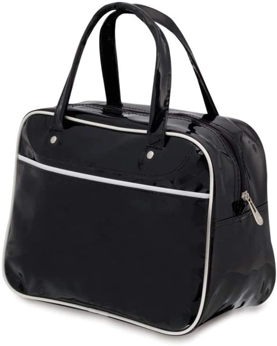 Bag in glossy black PVC with white piping. Reinforced handles with metal rivets and main compartment with zipper closure. With inside pocket. 28 x 22 x 13 cm | 223 gr.Bag in glossy black PVC with white piping. With inside pocket. 28 x 22 x 13 cm | 223 gr. Reinforced handles with metal rivets and main compartment with zipper closure Product is made in China, and passed European Quality Control