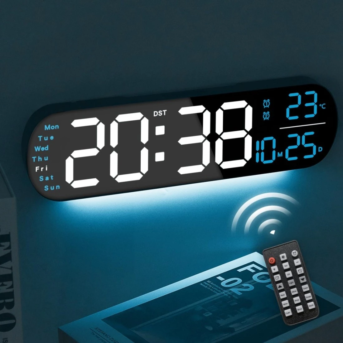 ã€13.7 Inch Large LED Display】This digital wall clock has a large 13.7-inch screen that displays the temperature, time, date, day of the week, and DST all at once. If you do not like the flashing of the second hand, you can set it to remain still.The clock has a 3-inch prominent number display that is very friendly for seniors and those with visual impairments. It's also a great addition to decorate your room, ã€RGB Modern Night Light】Our digital wall clock comes with a bottom night light, with 8 fixed colors and 1 multiple color-changing option. You can set your preferred color according to your current mood, creating a warm atmosphere for your living room. It can also be used as a night light in your room, so you don't have to turn on the lights when you go to the bathroom at night, ã€Auto DST & Auto/Manual Brightness】If you live in an area that observes DST, you can turn on or off DST by pressing and holding the "-" key on your device. This will also show/hide the DST icon.Our wall clock features 10 adjustable brightness levels that you can easily adjust manually using the remote control for comfortable visibility. The LED clock also has a built-in automatic dimming sensor that adjusts brightness as light changes, smart to provide you with the needs, ã€Have to Plug-in & Memory Function】The wall clock is not powered by batteries, it must work together with a 5V/2A power adapter (not included) and an 11.5-foot cable cord (included). Using 2 AAA batteries (not included) only provides memory, even if there is a power outage, the time data will not be lost, and there is no need to reset, ã€Timer & Wide Application】The timing function of the wall clock can count up or down for up to 99 minutes and 99 seconds. Ideal for setting recipe timers in the kitchen or pushing your personal best at the gym.The large wall clock is suitable for living room, garage, office, warehouse, classroom, gym, kitchen, etc. It is the ideal gift for households and elderly people