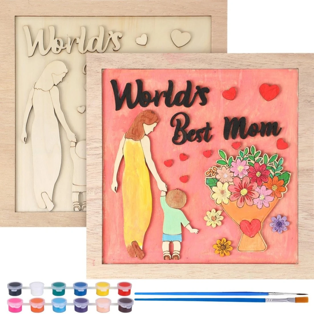 Creative Expression: the DIY mothers gifts crafts set includes a frame, a wooden board with pre engraved text and patterns, a set of 12 colors with two brushes and a color palette, and a 9ml glue; And the frame size is about 10 x 10 x 0.4 inches / 25 x 25 x 1 cm, Laser Engraving: the thank you mom gifts feature intricate laser engraving on all details; This attention to detail adds a touch of sophistication to the gift, making it truly special; can choose to color the frame or keep the wood color, both of them are beautiful, Easy DIY Process: you can easily detach the text and pattern parts, apply chosen colors to the DIY frame and wooden pieces, and then use the glue to affix the wooden pieces in place; It's important to note that the glue may not dry instantly, requiring 2-3 hours to firmly set; Additionally, placing the product in a well ventilated area can help reduce odors from the glue, Thoughtful Design: crafted from quality materials, the Thanksgiving Day gifts for mom are designed to be sturdy; When detaching the parts, care should be taken with delicate areas to prevent breakage; The frame also includes hooks and support at the back for easy hanging or display, Suitable for Various Occasions: this DIY mothers day gifts from daughter crafts cute ideas set is not limited to Mother's Day, but is also ideal for birthdays, Christmas, or any other special moments to show your love to mother; It's a versatile and thoughtful present for many occasions