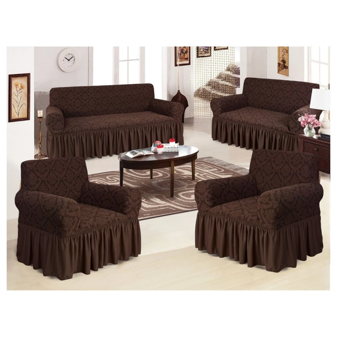 4-Piece Stretchable Sofa Cover Set Chocolate Brown Jacquard Fabric Seven Seater Couch Cover Set 3211 Combination