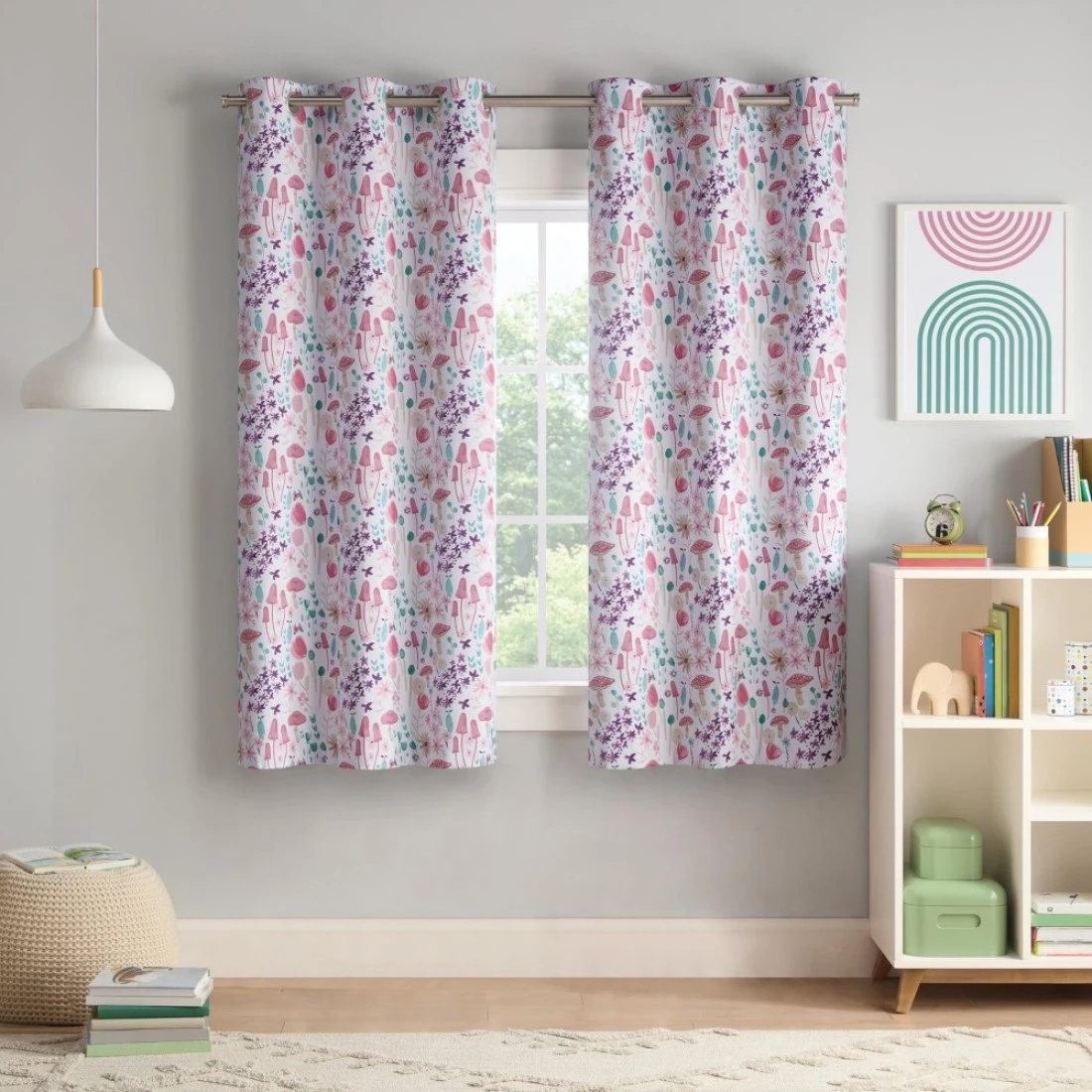 Eclipse Blackout Curtain Mushroom and Floral Print Kids Curtain with Metal Grommets 63 in x 37 in Thermaback 100 Blackout Curtain Curtain for Kids Room or Playroom 1 Window Curtain Multi