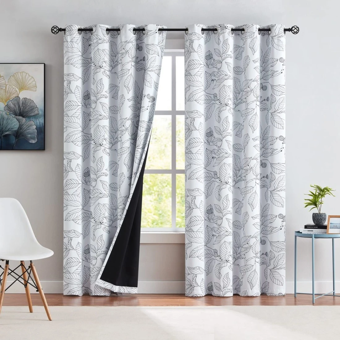 Xwincel 100% Blackout Curtains for Bedroom Black Leaf Pattern on White Curtains 63 Inches Long for Living Room Darkening Thermal Insulated Curtain Panels Botanical Print Grommet Window Drapes 2 Panels