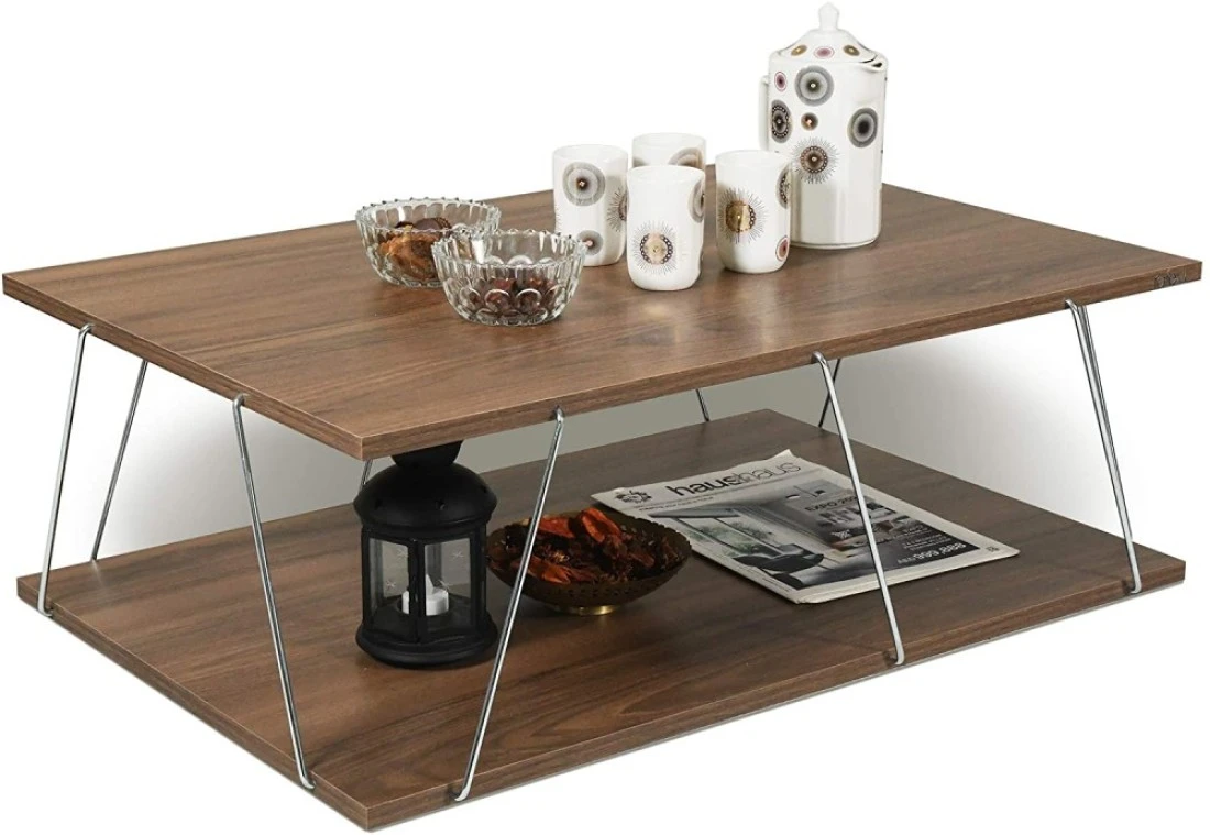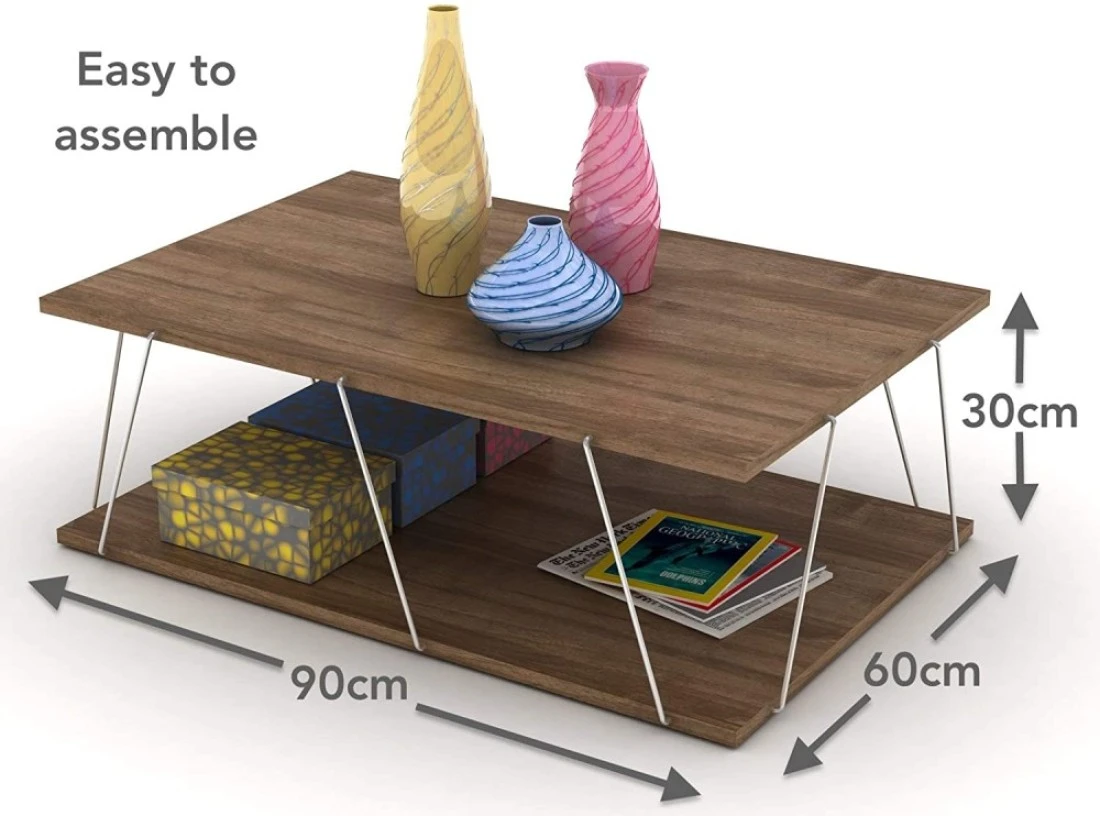 A WELCOMING LOOK – Give your living room a modern, stylish look with this coffee table from Tars collection, which makes for an alluring addition to any home setting. QUALITY CONSTRUCTION – This coffee or reading table boasts a durable construction using white finished melamine coated chipboard top and bottom shelves and interstellar chrome metal lines. DESIGNED FOR CONVENIENCE – The Tars range living room coffee table offers a wide top surface to spread out your snacks. It has a lightweight design for easy movement and easy to clean, smooth surface. FUNCTIONAL DESIGN – This coffee living room table features a wide, rectangular top surface and a bottom shelf to provide ample display/storage space for snacks, magazines, and more. This coffee table for living room is designed for easy assembly with assembly instructions included. Dimensions: rectangular coffee table: 90 (w) x 60 (d) x 30.5 (h) cm. Enhance the look of your living space with the contemporary coffee table from the tars range by rafevi. Featuring chrome finished interstellar lines, this table features a rectangular top and open bottom shelf, both made of top-grade melamine coated chipboard in walnut finish. The top surface provides ample space for a spread of snacks and drinks while the lower shelf is great for displaying stacks of books, blankets, or your favourite magazines. This coffee table for living room is designed for easy assembly with assembly instructions included. Dimensions: rectangular coffee table: 90 (w) x 60 (d) x 30.5 (h) cm.
