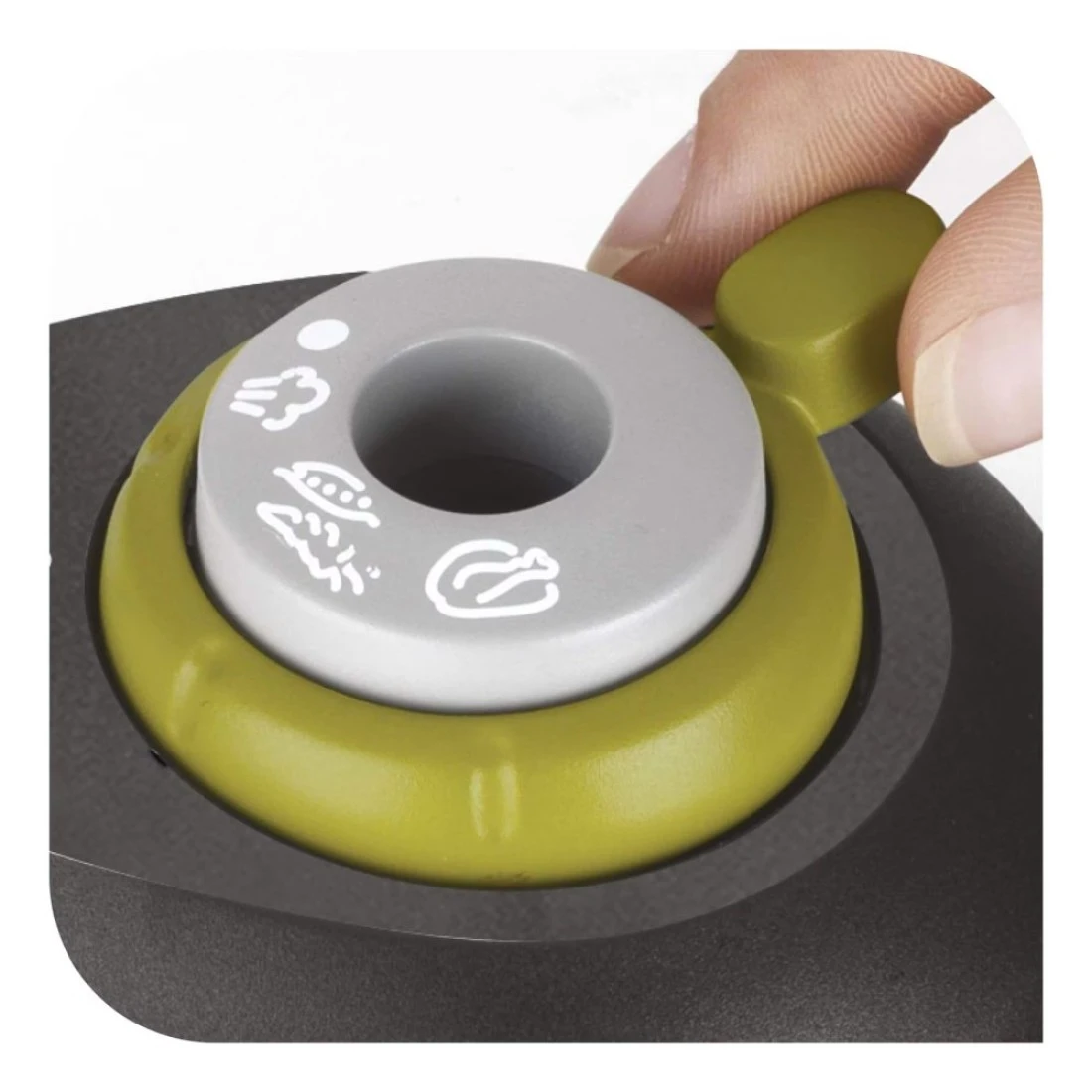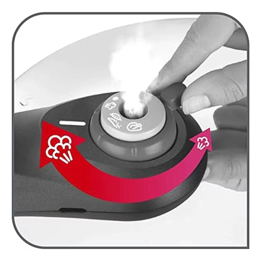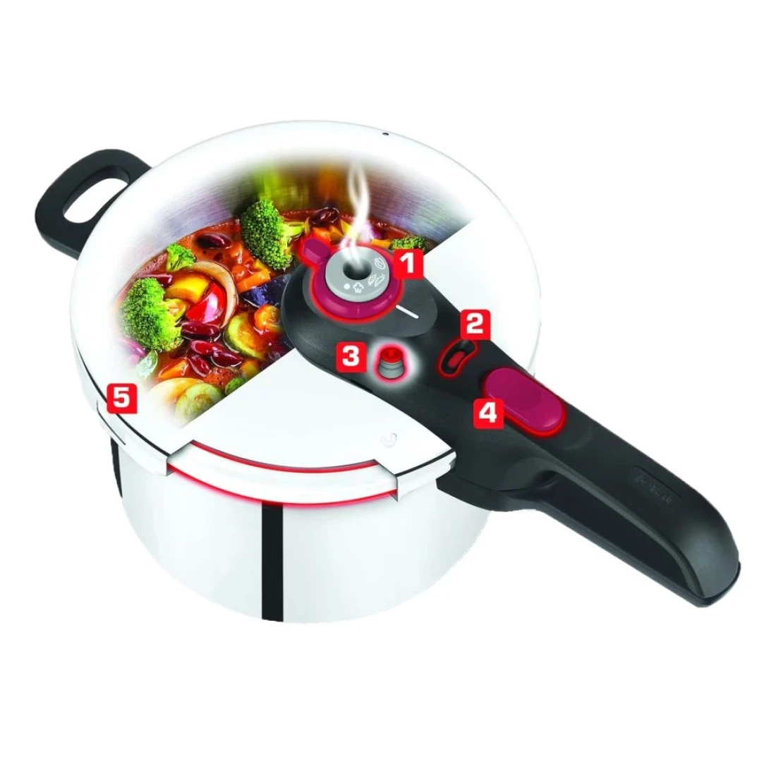 - Safety valve releases the pressure and steam escapes horizontally from the top of the lid in case of overpressure