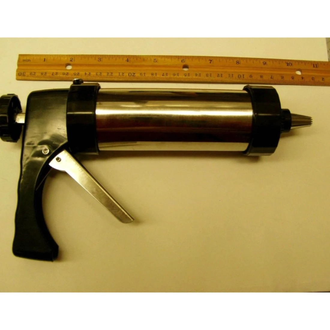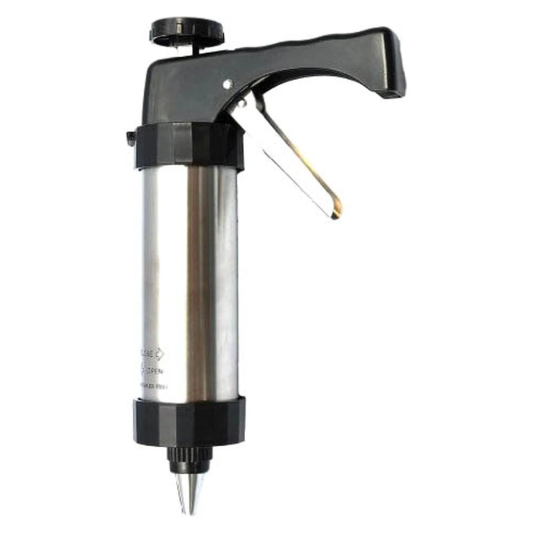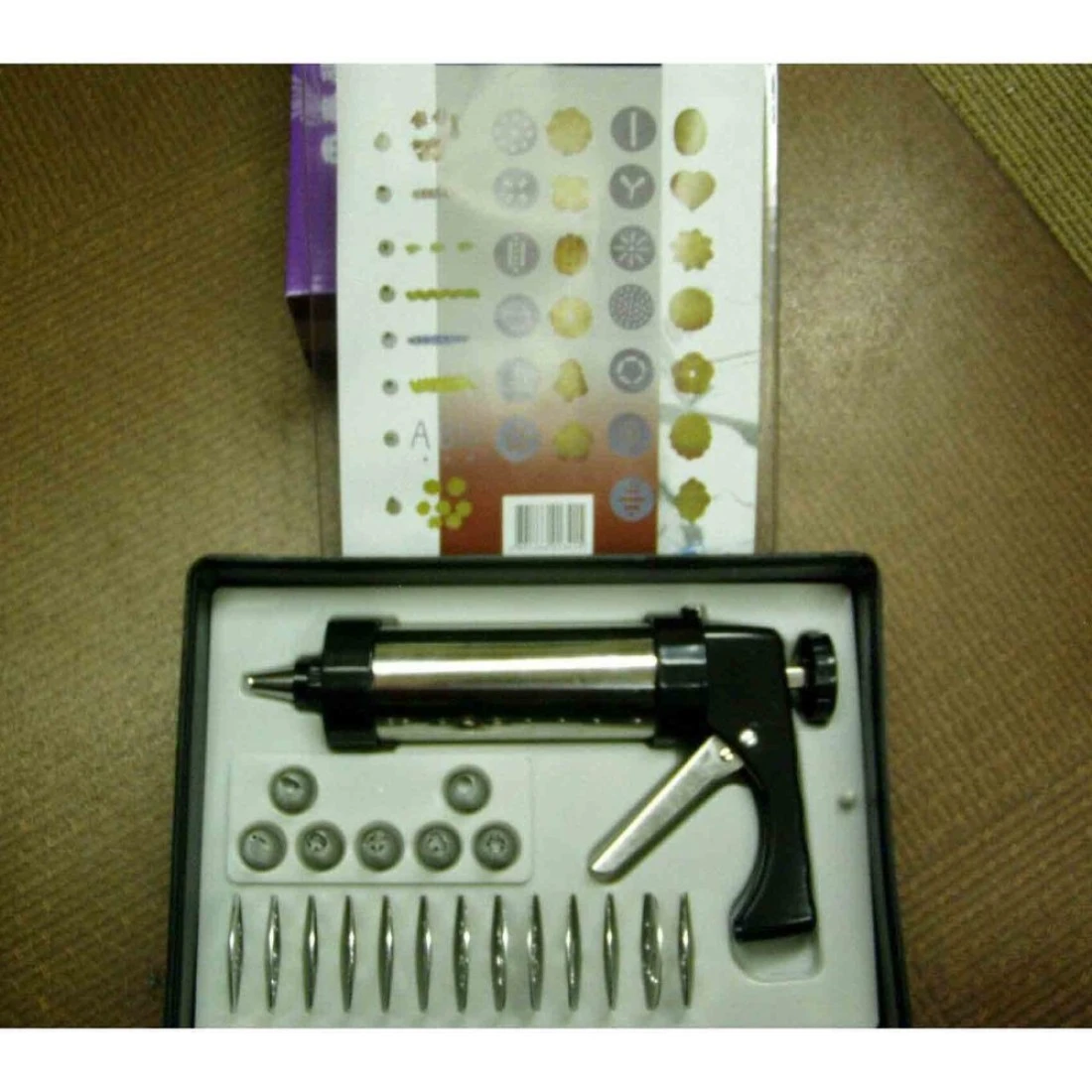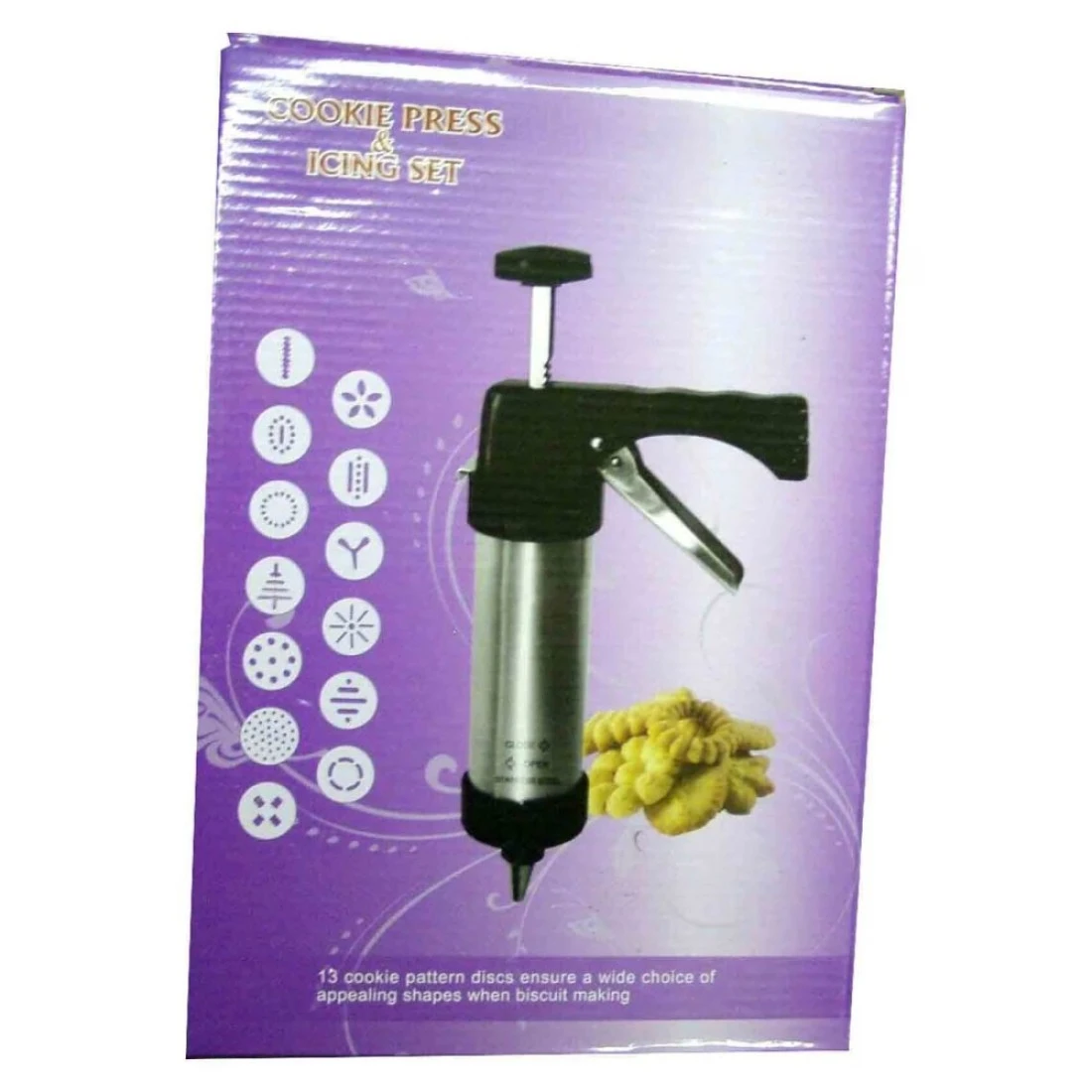 - Stainless and plastic cookie dough and icing press with 13 cookie pattern discs and 8 frosting pattern nozzles
