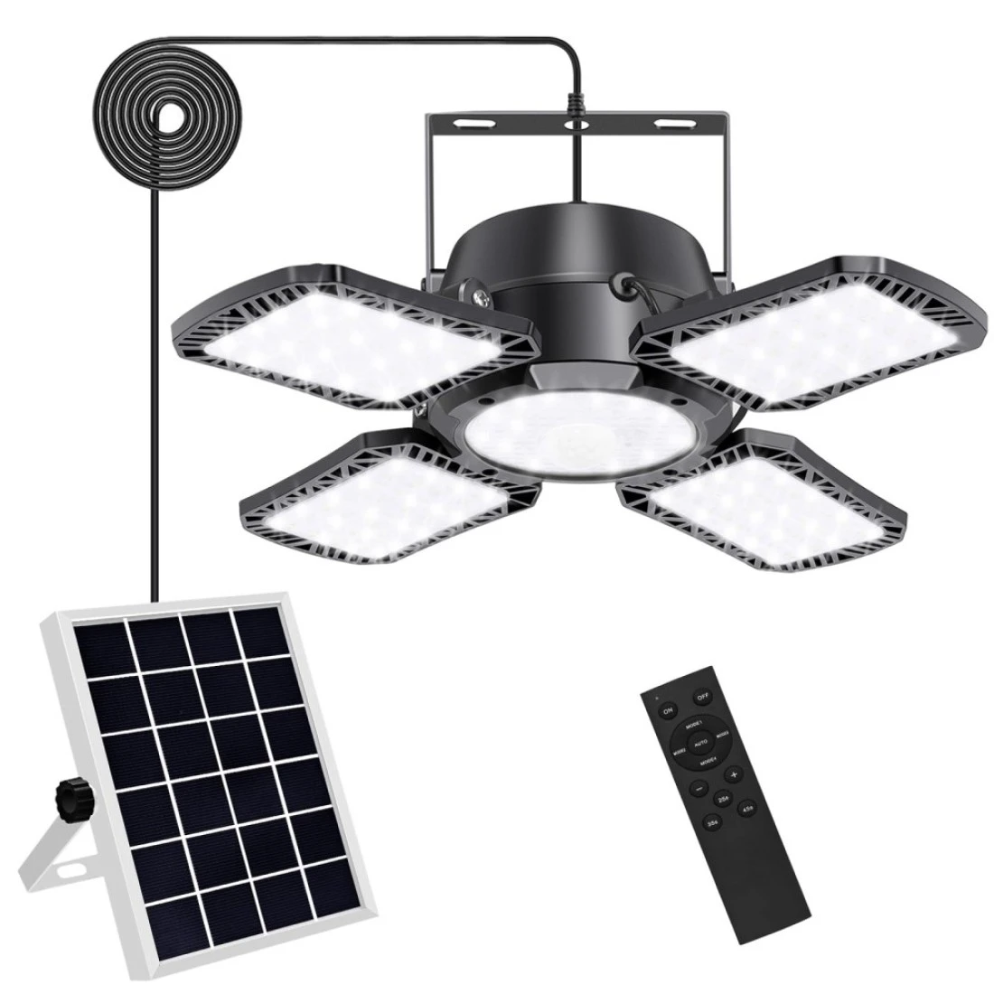ã€Upgrade 4 and 1 heads led panel design】The upgrade 176 LED motion sensor light has 4 Deformed leaf and one head led panel in the middle, more leds and more brightness then others. The five led panels and motion detection captures movement lights up from all possible angles, and you can also adjust them to your need., ã€4 Lighting Modes with Motion Sensor】This motion sensor solar pendant light has 4 lighting modes.Mode 1: Dim to bright after motion at night. Mode 2:Off to bright after motion at night. Mode 3: Always Light at night. Mode 4:Off to bright on daytime and at night after motion. Unlike most solar lights that require outdoor installation and only turn on at night, this shed solar lights work indoors and even in daytime when you choose this mode., ã€With Remote Control】 Solar Lights Indoor with remote. Remote Control Function: You can turn on/off the lights and select different modes by remote control,and press "+/-" switch to change the brightness. so you can easily select different modes and brightness to meet your different requirement(One remote can control multiple lights)., ã€Split Design with 6.5 feet/5M wire,Fit for Outdoor and Indoor】The solar powered shed light and the solar panel are separated, and the waterproof wire length is 16.5 feet, so it can be used indoors and outdoors such as shed, gazebo, balcony, garage, barn, home, garden, yard, patio, park, porch,chicken coop, pavilion, ã€IP65 Waterproof & Easy to Install】IP65 waterproof and ABS material can withstand in rain and other extreme weather conditions. Each light is connected to the solar panel by a 16.5ft cable, which allows you to leave the solar panel outside for charging while hanging the light indoors or under roof.