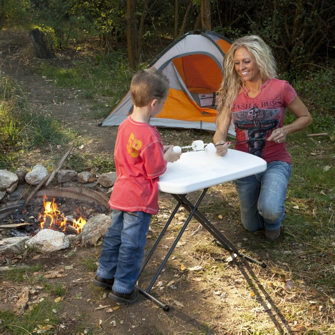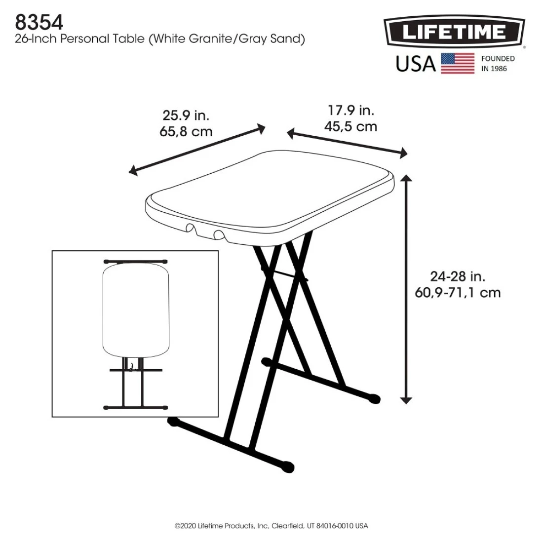 The Lifetime 26-Inch Personal Tables® are constructed of high-density polyethylene and designed for strength and stability. The tables feature three adjustable height settings from 24 in. to 28 in. for versatile use. The steel frame design folds flat for easy storage and is protected with a powder-coated, weather-resistant finish. The tables are built for indoor or outdoor use.Item will be delivered in Shrinked and bubble wrapped.