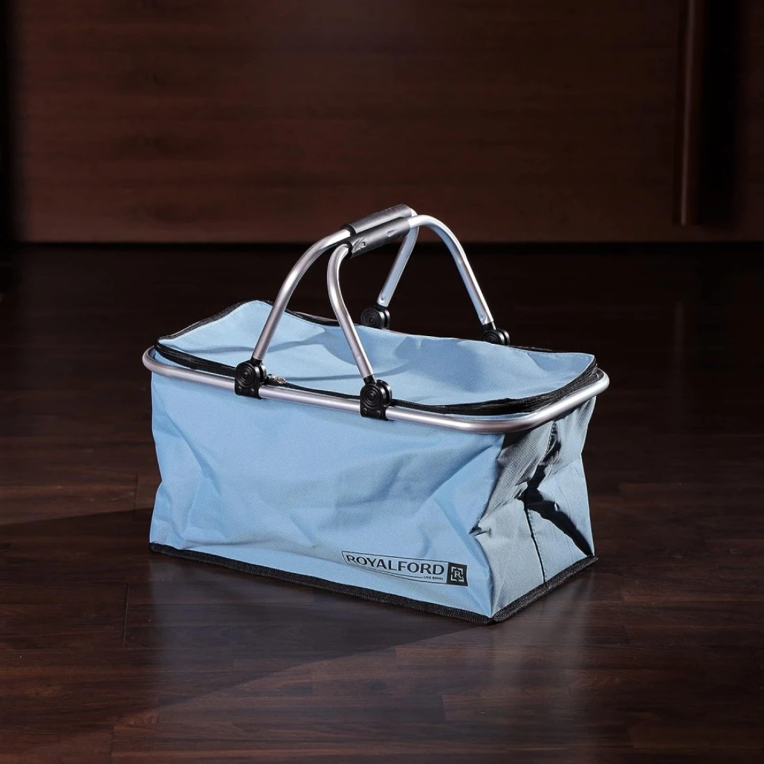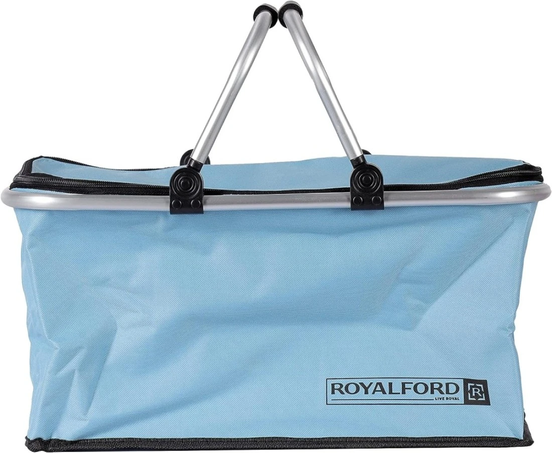 Royalford 30L Insulated Picnic And Grocery Basket- Rf11375 Multi-Purpose Utility Basket With Aluminum Handle And Lid Break-Resistant, Light-Weight, Stylish Construction Blue