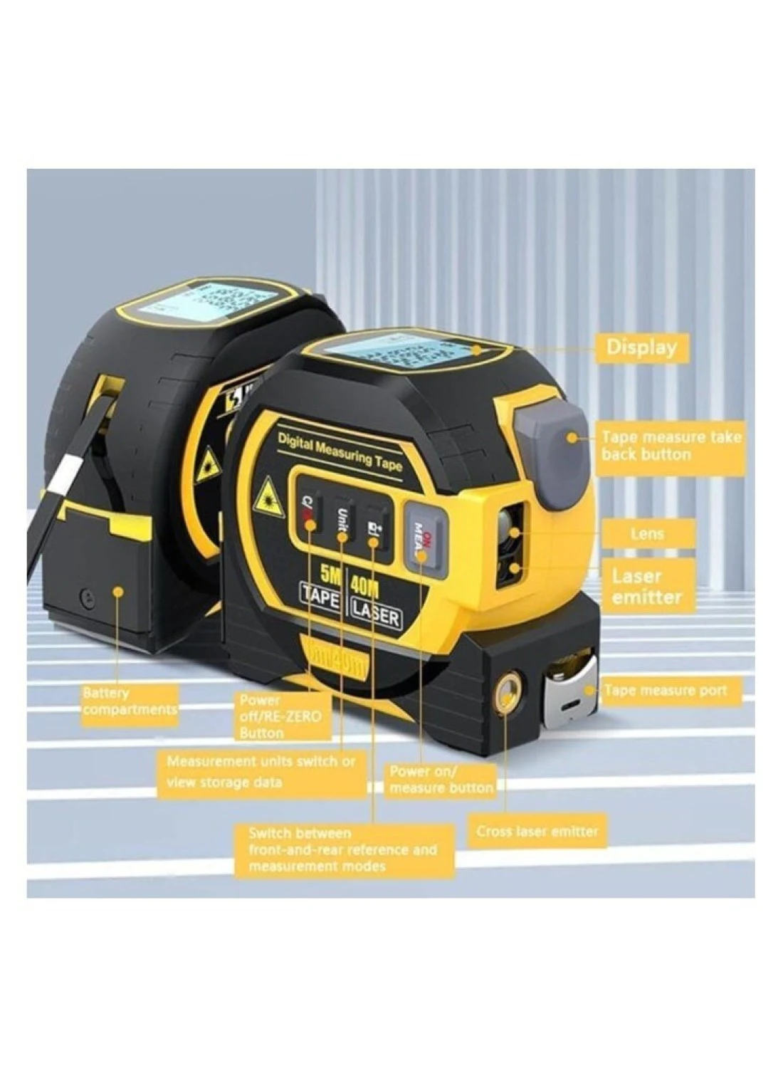 3-in-1 Laser Rangefinder with 5m Tape Measure & LCD Backlight Display – Digital Distance Meter for Area & Volume Measurements, Building & Surveying Equipment