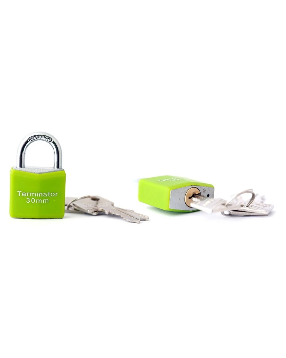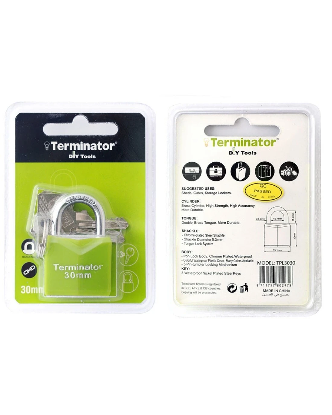 The Terminator brand Pad Lock (30mm) (Green) is a sure-fire and secured option to ensure your valuables are kept harmless. Thanks to the chrome-plated stainless steel shackle material, this padlock is weather resistant and will not disintegrate. It comes complete with three waterproof nickel plated keys. Four pin tumbler with self-locking mechanism ensures the padlock is highly secure against forceful attacks. The outer body is made of highly durable and resilient iron metal that will last for years to come.