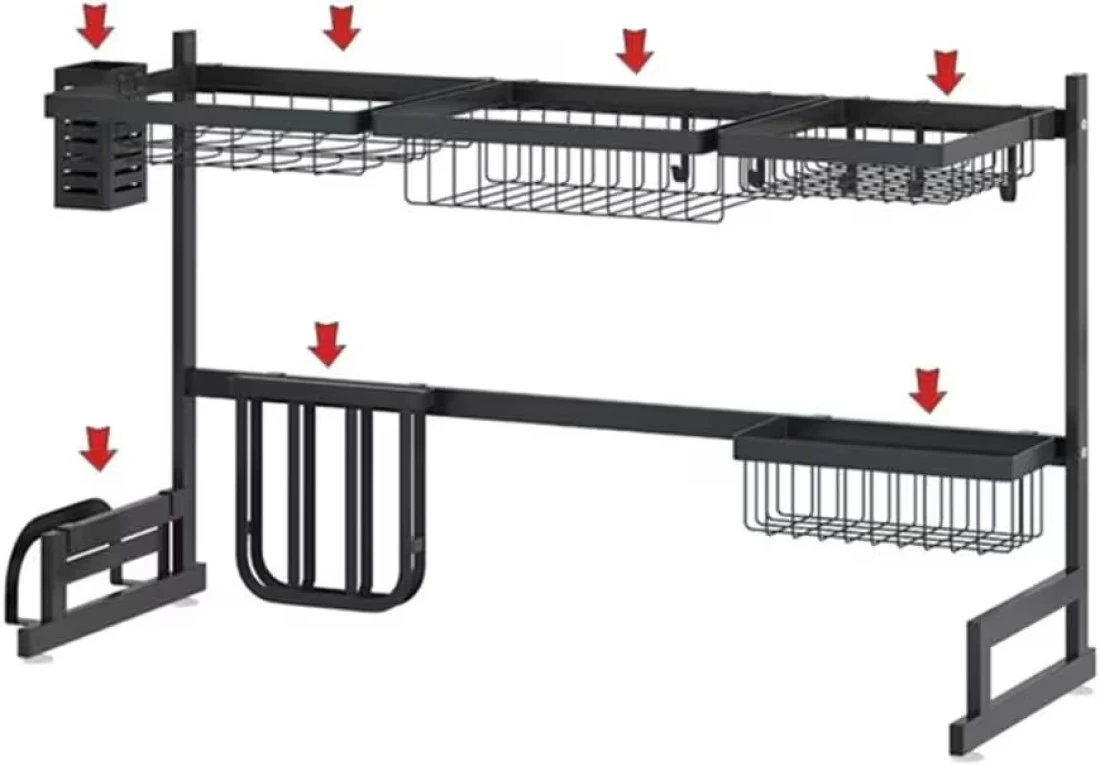 Large Capacity - The set includes: 1 dish rack, 1 bowl rack, 1 knife holder, 1 fruit & vegetable basket, 1 chopping board rack / pot cover holder , 1 square basket / detergent holder, 1 cutlery holder/Knife and fork holder, and 5 hooks. All parts could be adjustable and removable
