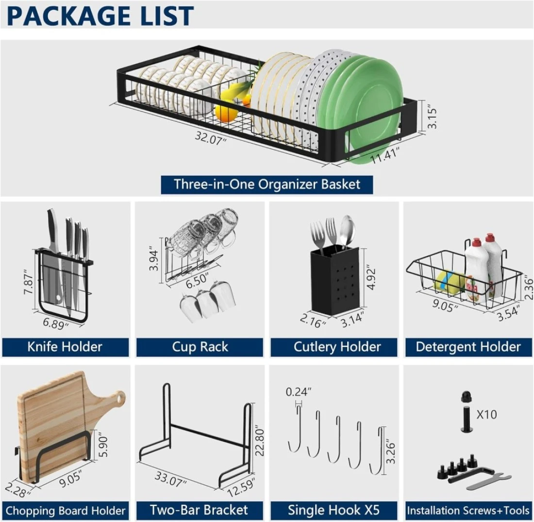 ALL-in-ONE VERSATILE ORGANIZER: The versatile dish drying rack includes: 1 x three-in-one basket(including 1 plate rack,1 bowl rack and 1 fruit & vegetable basket),1 x knife holder,1 x chopping cutting board rack,1 x detergent holder,1 x cutlery holder and 5 x hooks.All these parts could be adjustable and removable thus the arrangement is totally up to your preference,which meet all your needs.