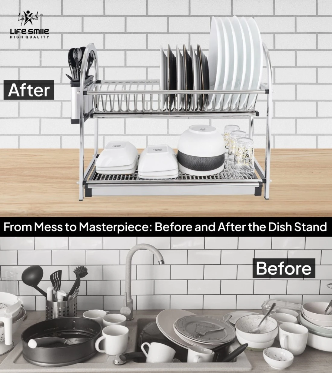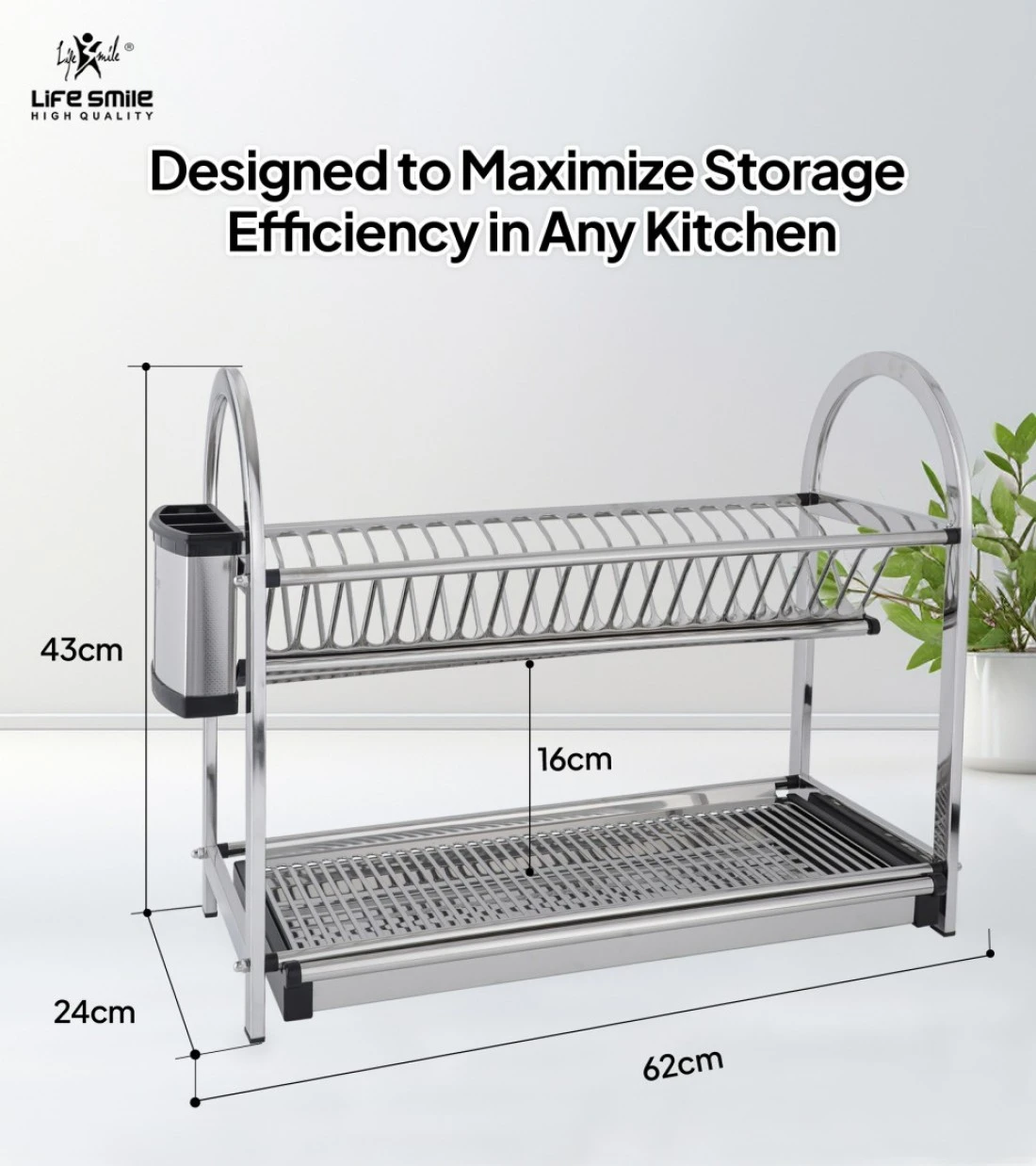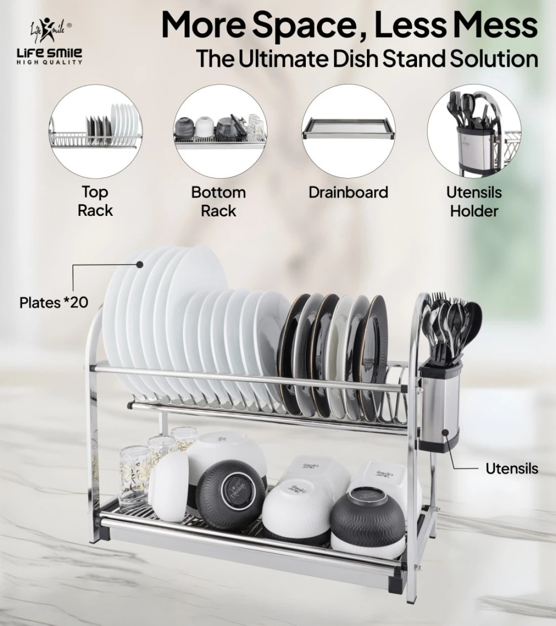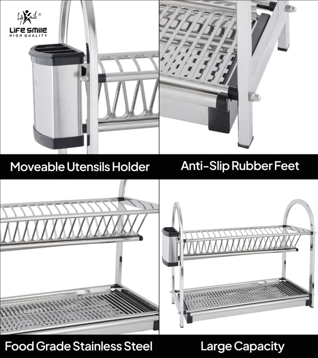 LIFE SMILE Dish Rack - 2 Tier Countertop Dish Drying Stand With Removable Drip Tray - 18/10 Stainless Steel with Removable Utensil Holder - Anti Slip and Rust Proof Dish Drainer