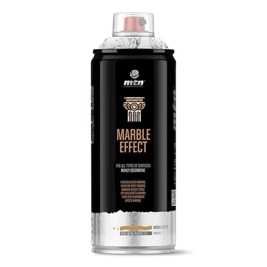 The MTN PRO Marble Effect Paint is a decorative spray paint, based on acrylic solvent, which lends a marble-like appearance to all kinds of surfaces. Thanks to its characteristics, it can be applied to metal, most plastics, stone, ceramics, glass and other pre-painted surfaces. The paint has an excellent opacity and expands on the surface using fine threads of colored lacquer, simulating the “veins” of marble. To improve adhesion, we recommend applying a specific primer, depending on the surface. This product is ideal for both interior and exterior projects; in the case of the latter, it is advisable to use the MTN PRO Acrylic Varnish to enhance its resistance.