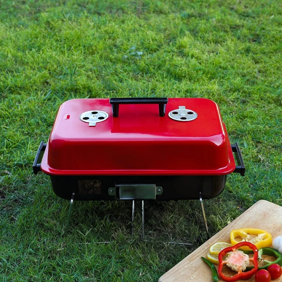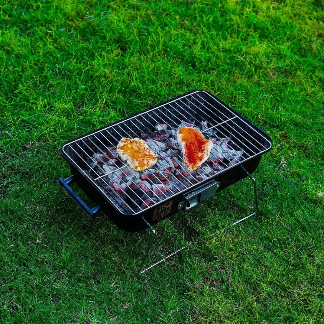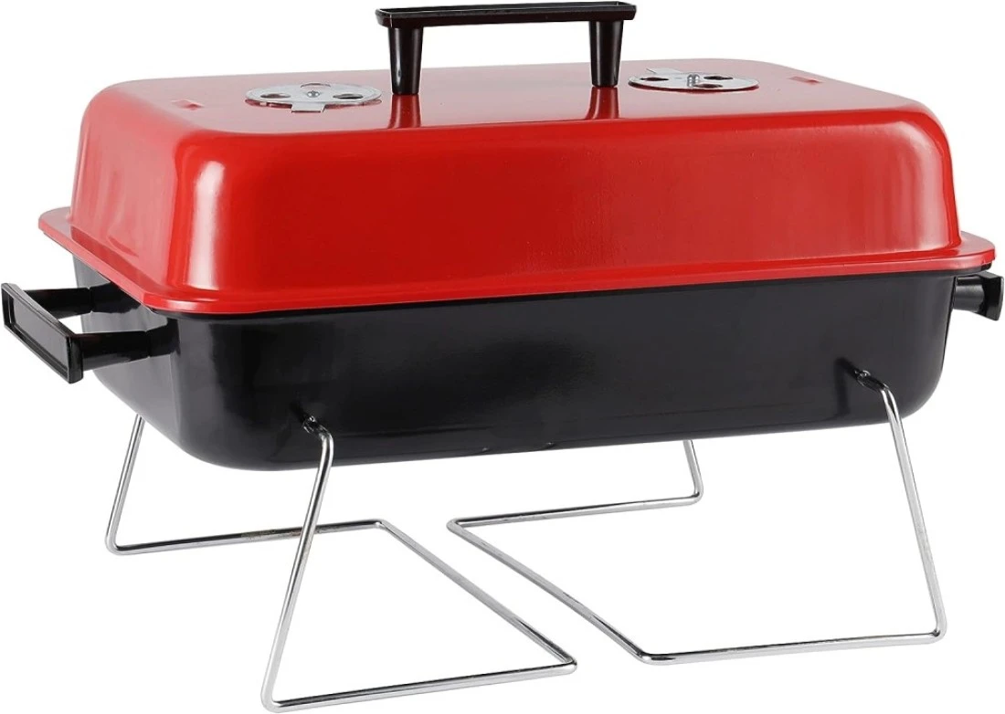 A hamburger stove made from heavy stamped steel construction with chrome plated cooking grip to ensure durability. It is compact and portable charcoal grill. Perfect for hiking, camping, adventure trip and other outdoor entertainment. It has 170 square inches cooking surface and is perfect for grilling steak, lamb, chicken breast, bacon, burger, fish and various vegetables. Product dimension: 42x27.5x28 cm.