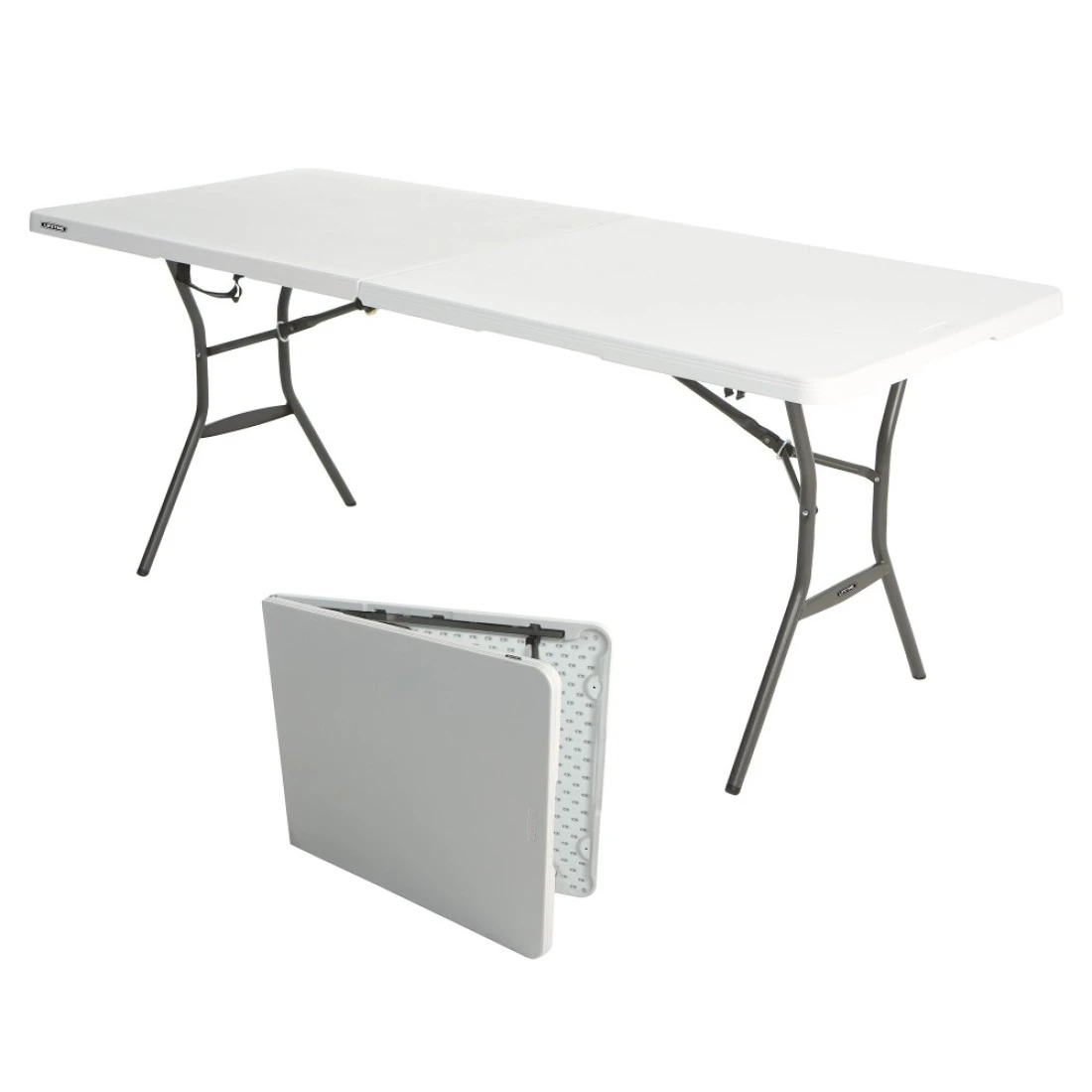 Lifetime 6-Foot Essential Fold-In-Half Tables are constructed of high-density polyethylene and have a convenient folding design for easy transport and storage. The lightweight design, auto-locking feature, and convenient carry handle make it easy for anyone to set up and take down. Our tables are UV-protected, will not crack, chip or peel, and are built for indoor and outdoor use. The patented steel frame design provides a sturdy foundation and is protected with a powder-coated, weather-resistant finish. Ideal for family game night, outdoor actifities and more, Lifetime’s Fold-In-Half Tables are the perfect addition to your home.