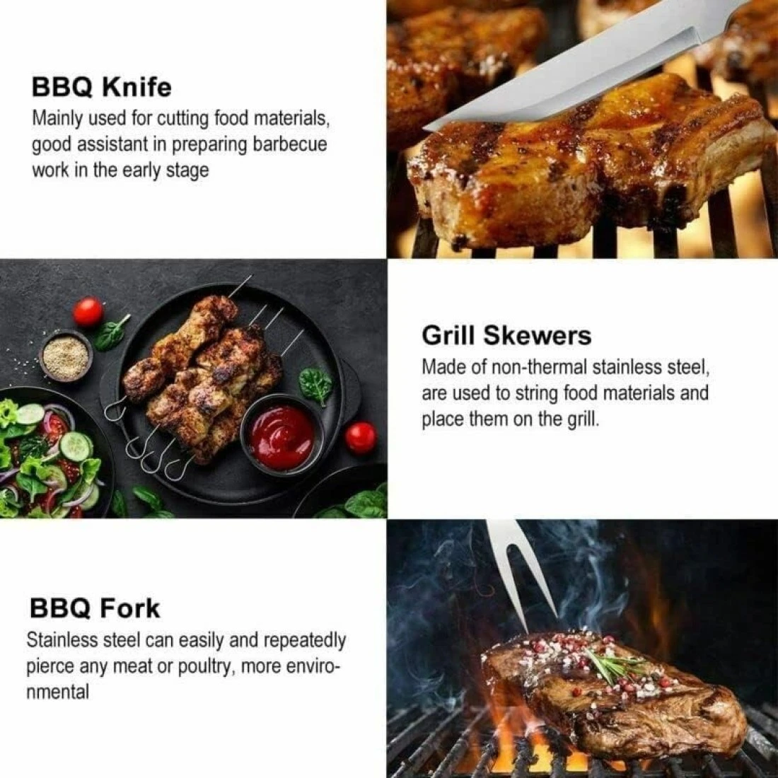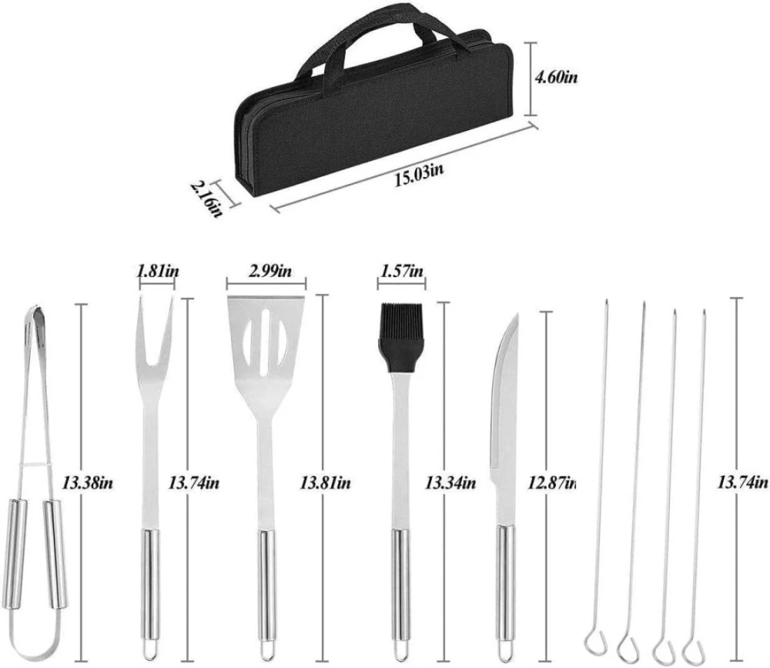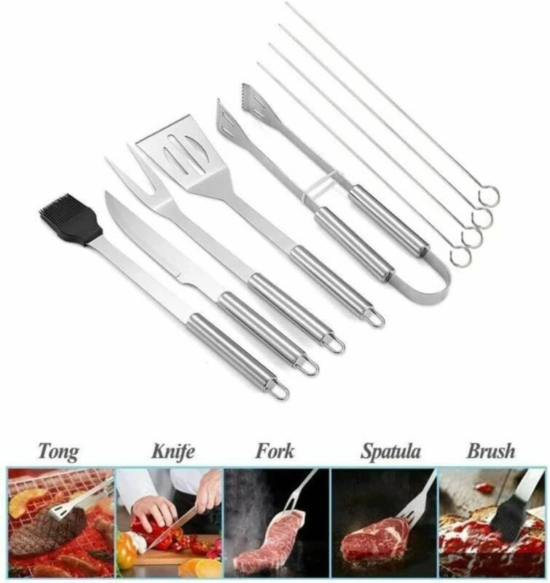 - It includes knife, fork, shovel, brush, clip and needles, very practical for BBQ.