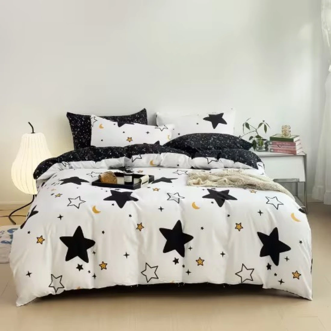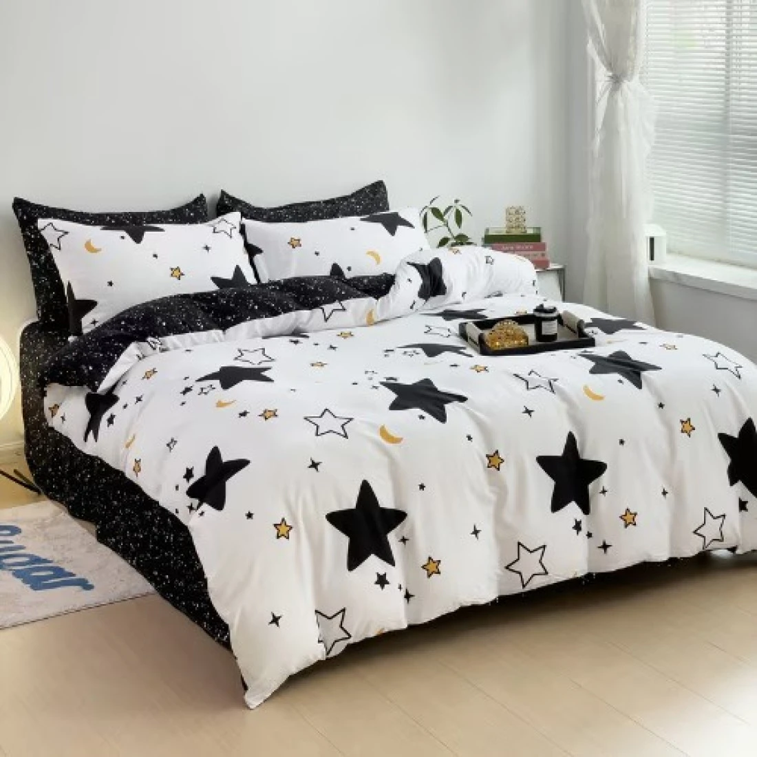 Single Size 4 Pieces Set, Reversible Duvet Cover Set, Blue Stars Design With Navy Blue Bedsheet Color