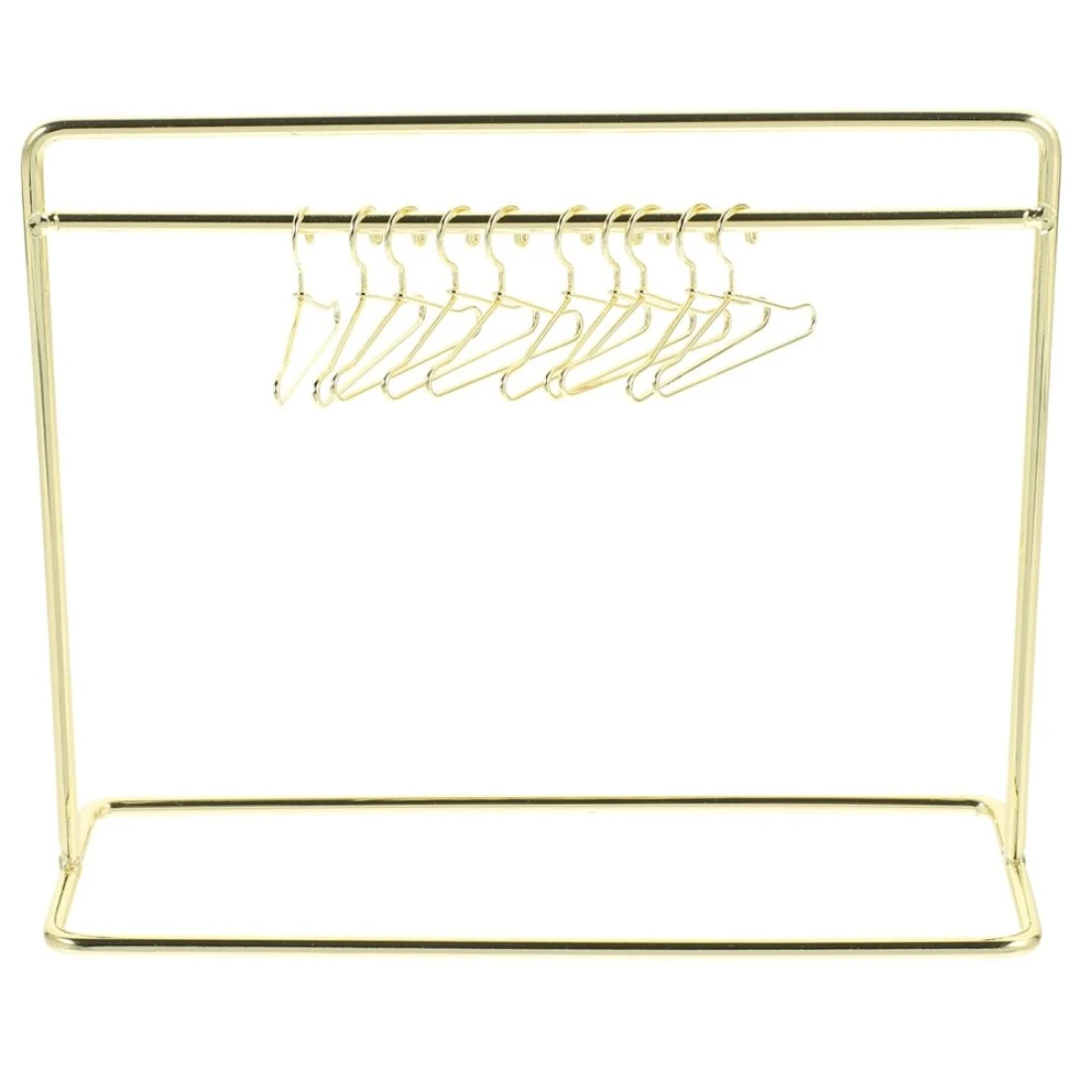 TOYANDONA Doll Garment Rack with Hangers Set Include Miniature Clothes Rack 10pcs Mini Metal Doll Clothes Hangers for Dollhouse Dress Outfit Gown Golden