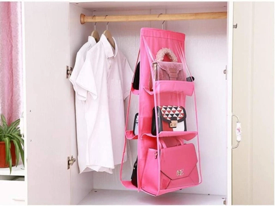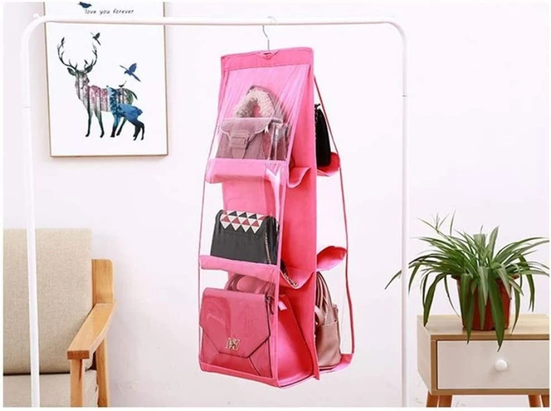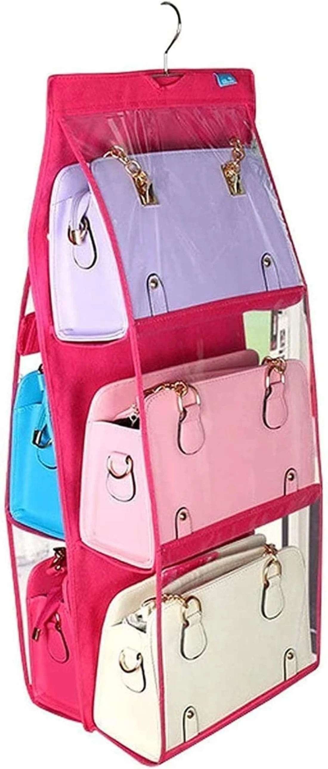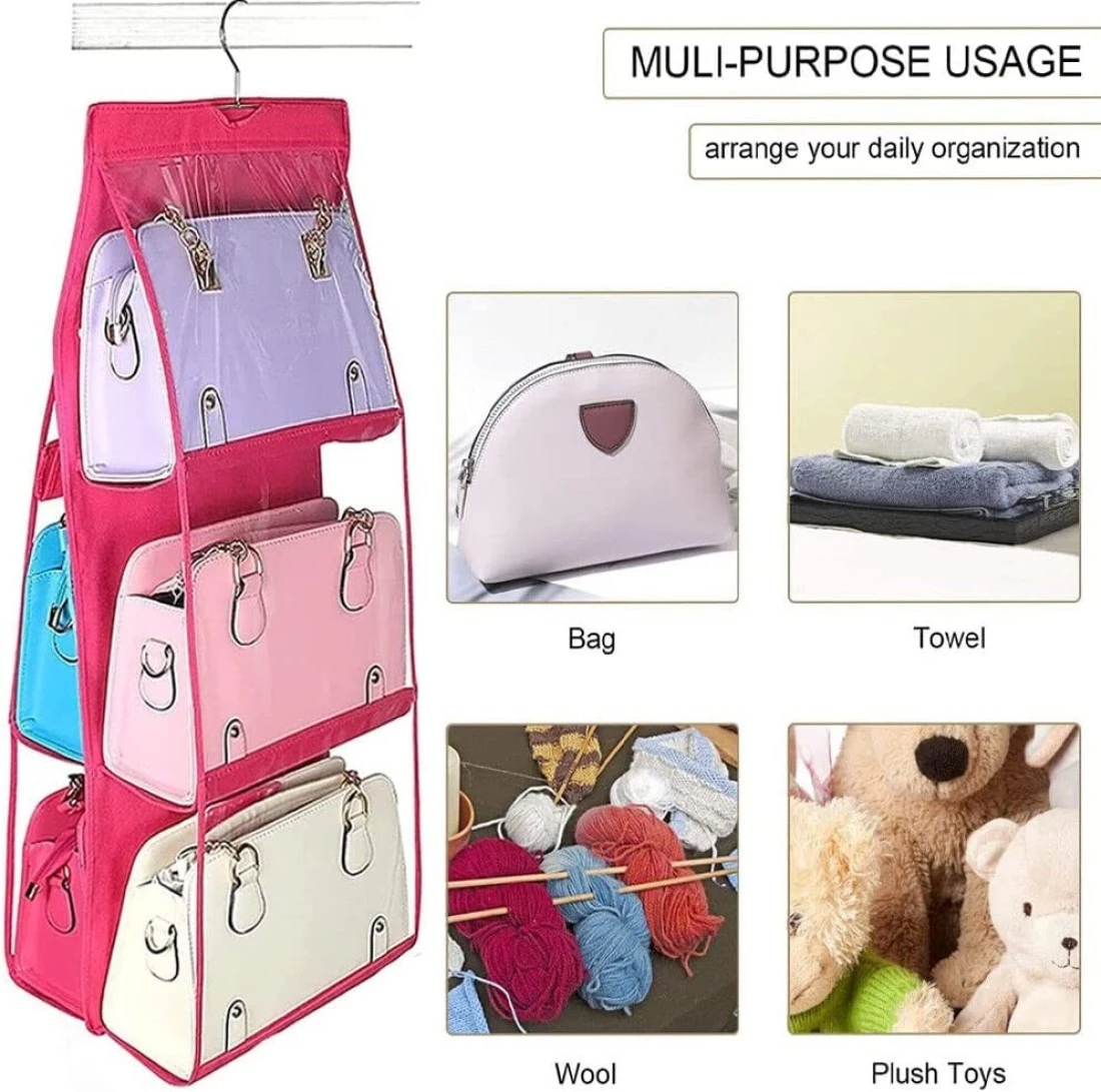 - Easy to hang: 6 storage pockets totally. 1 sturdy Stainless Steel Hook on the handbag organizer can easy to hangs on standard closet rod.