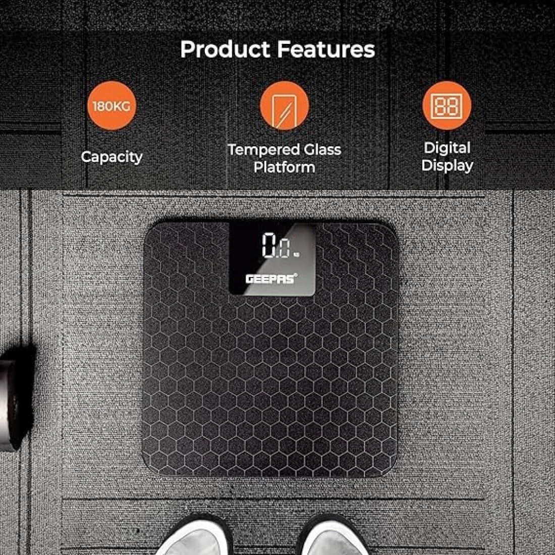 Geepas Digital Body Scale GBS46524UK, Maximum Weight Of 180kg, Anti Slip Glass Platform, Black