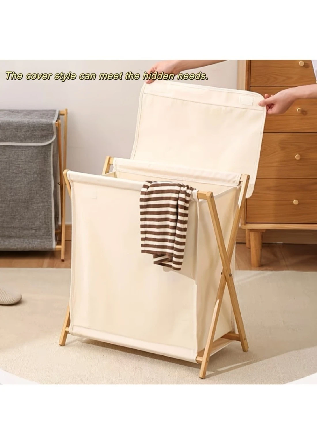 67L Bamboo Laundry Basket with Cover for Dirty Clothes Hamper Storage Organizer Portable X Frame Freestanding Toilet Sorter Cart for Bathroom and Bedroom Towels Blankets