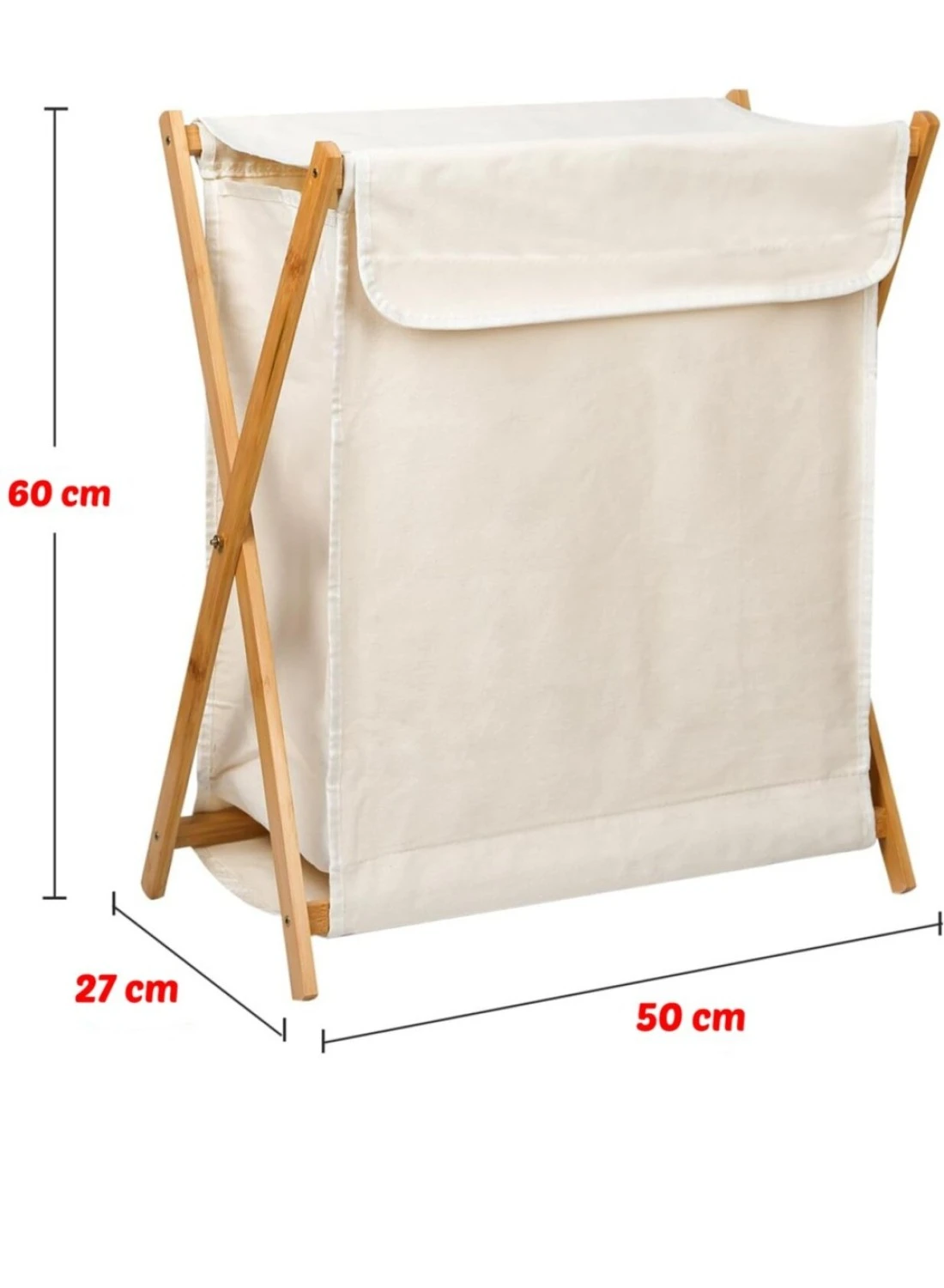 Product dimensions: 50L x 27W x 60Hcm, Color: Beige, Material: Wood Frame - Fabric Basket, Style: Modern, Capacity: 67 Litres