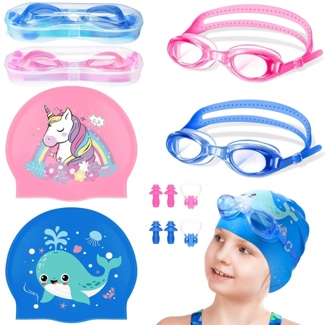 Considerable Combination to Meet Your Needs: you will receive 2 pieces of swimming caps in different styles, 2 pieces of swim girls goggles, 2 pairs of ear plugs and 2 pieces of and nose clips; The reasonable combination is sufficient for you to use and replace, and can easily meet your daily use and other requirements, Lifelike and Cute Design: our pool cap for kids is designed in 2 diverse patterns, including unicorn and whale, available in classical and charming colors; The lovely patterns and pretty colors make them more delicate and beautiful, Serviceable and Lasting: each swim cap is made of quality silicone, reliable and sustained, not easy to deform or break, and can be kept for a long time; The surface of the cap is smooth and comfortable to touch, easy for you to wear, Waterproof and Practical: our swimming caps for girls and boys are waterproof, keeping your hair dry, and the goggles can keep your eyes away from water, available in pink and blue, making your swimming time more joyful and relaxed, Proper Size to Apply: the size of these kids swim caps is about 20 x 23 cm/ 7.9 x 9.1 inches, elastic and appropriate, suitable for most boys and girls, easy to fit your head, not easy to fall off or make you feel too loose, the right elasticity will not tighten your head, bringing you a different and nice wearing experience