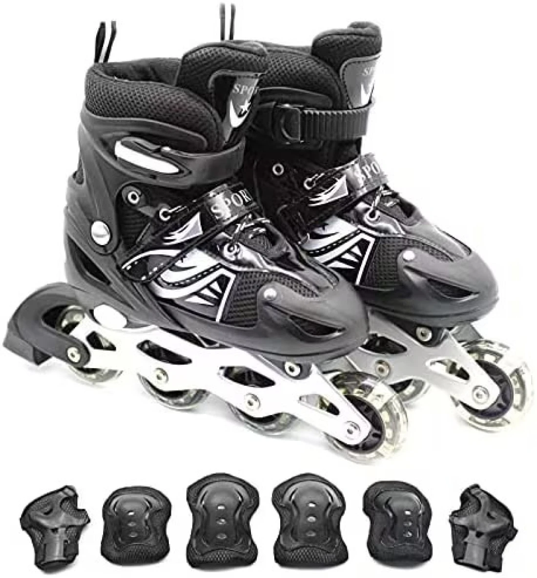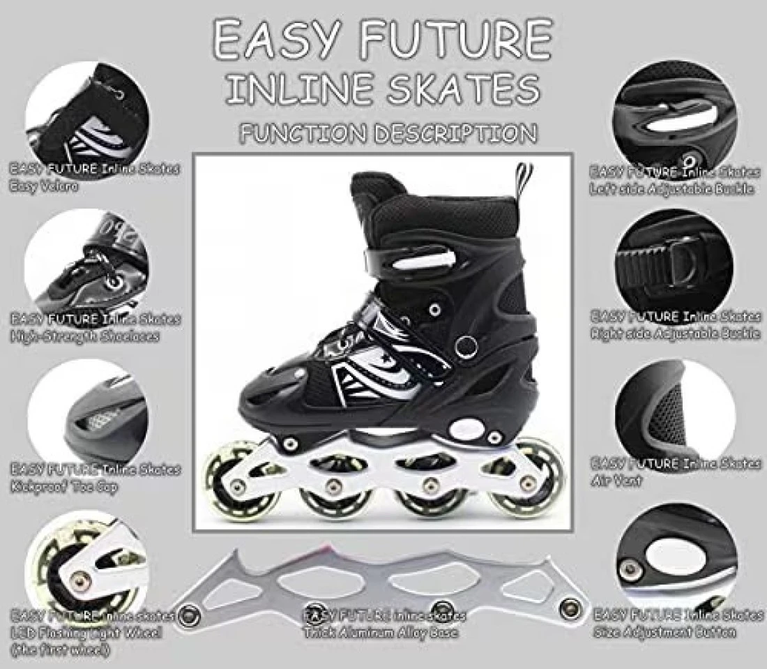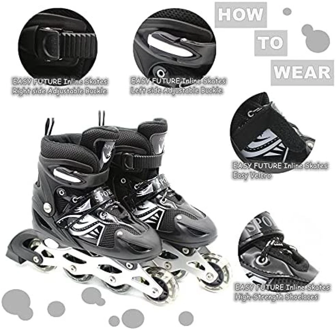 EASY FUTURE Inline Skates Adjustable Size Roller Skates with Flashing Wheels Children Skate Shoes Including Protective Gear Knee Elbow Wrist Black Large (39-42)