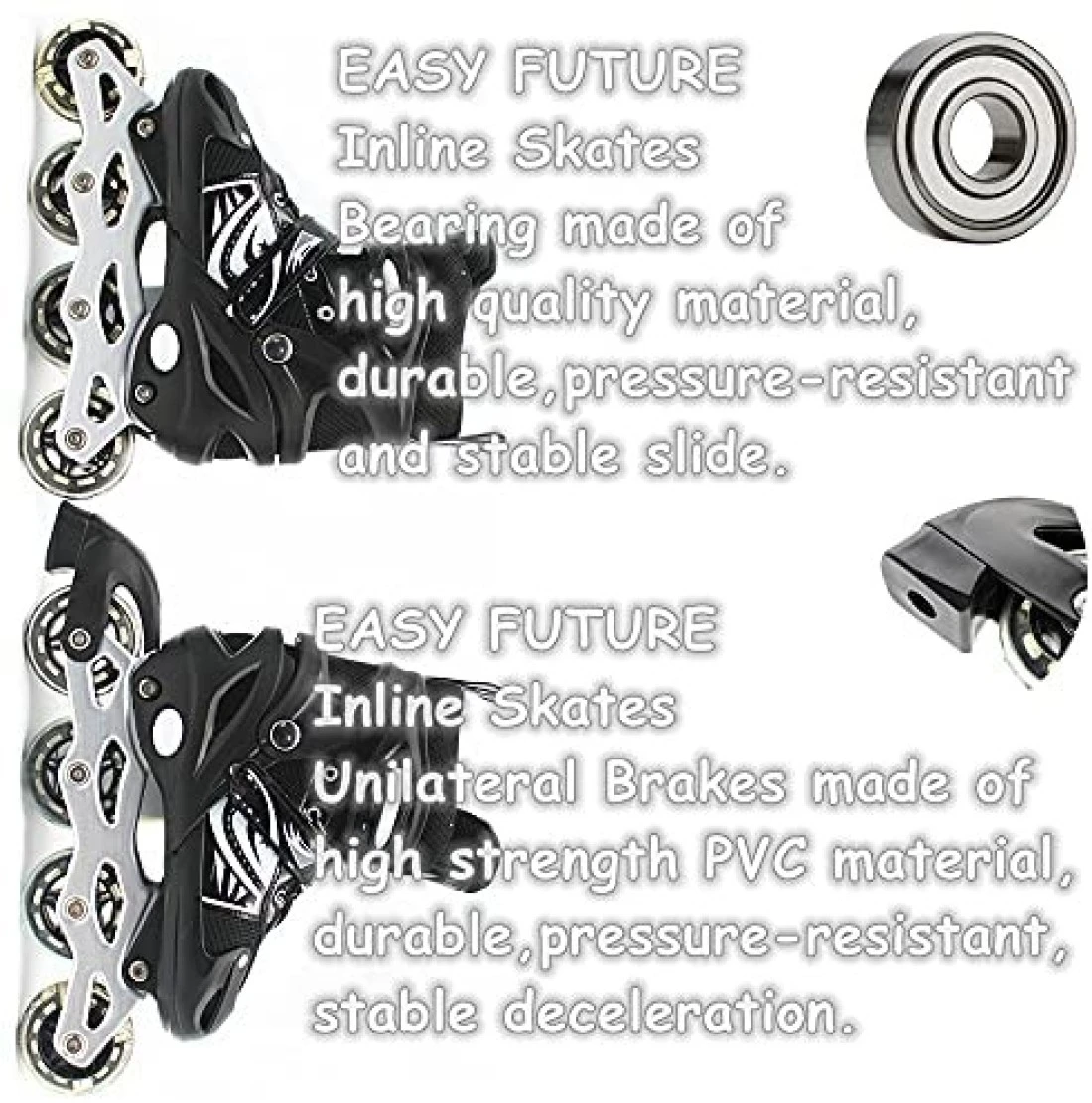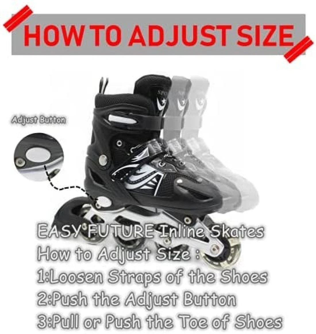Color classification red blue pink black Package Including Protective Gear Set Knee Elbow Wrist Wheel device Inline skates Applicable objects Male Female Child Shoe sizeThe size of the shoes is easy to adjust S number 3134 . M number 3538 . L number 3942 Wheel material high elastic wearresistant PU wheel Material PVC MUST KNOW BEFORE USING 1 Check that the wheels and moving parts are tight before use. If it is loose tighten it before use to ensure that there are no problems. 2 Regularly replace the brakes and ball bearings. 3 Children and young children must be accompanied by an adult. Wear Helmet and Protective Gear wrist arm and knee protection.before use to avoid accidents. 4 Avoid using on sidewalks streets or main roads to avoid injury to pedestrians and surrounding users. 5Keep control when skating. 6There is no towing vehicle. MUST KNOW BEFORE BUY 1 Manual measurement of the product the error is small. Please refer to the actual size. 2 The photo was taken under natural light because there is a slight color difference between the device and the display please understand.