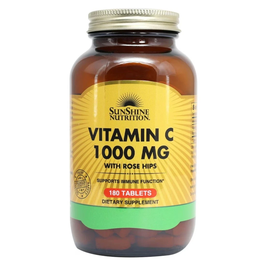 Sunshine Nutrition Vitamin C With Rose Hips 1000mg 180 Tablets is a dietary supplement that provides a high dose of vitamin C along with the added benefits of rose hips. Vitamin C is known for its immune-boosting properties and antioxidant effects while rose hips are rich in antioxidants and can help support joint health. These tablets are easy to swallow and can be taken daily to support overall health and well-being.