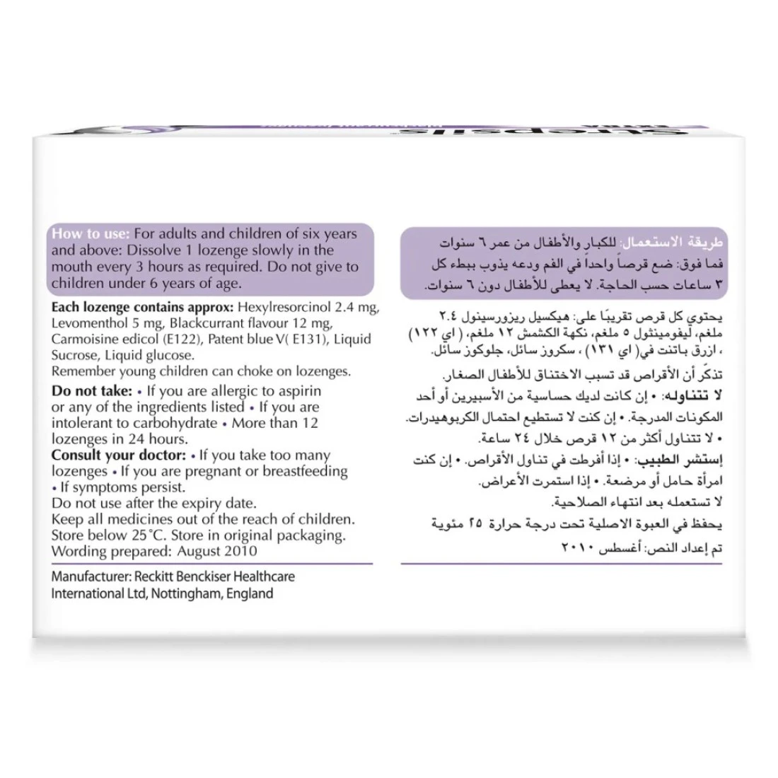 ingredients : Hexylresorcinol 2.4 Mg. Also Contains: Sucrose, Glucose, Levomenthol, Blackcurrant Flavour ( Containing Propylene Glycol), Carmoisine Edicol (E122), Patent Blue V (E131). Each Lozenge Contains 1.1g Glucose and 1.4 G Sucrose.
