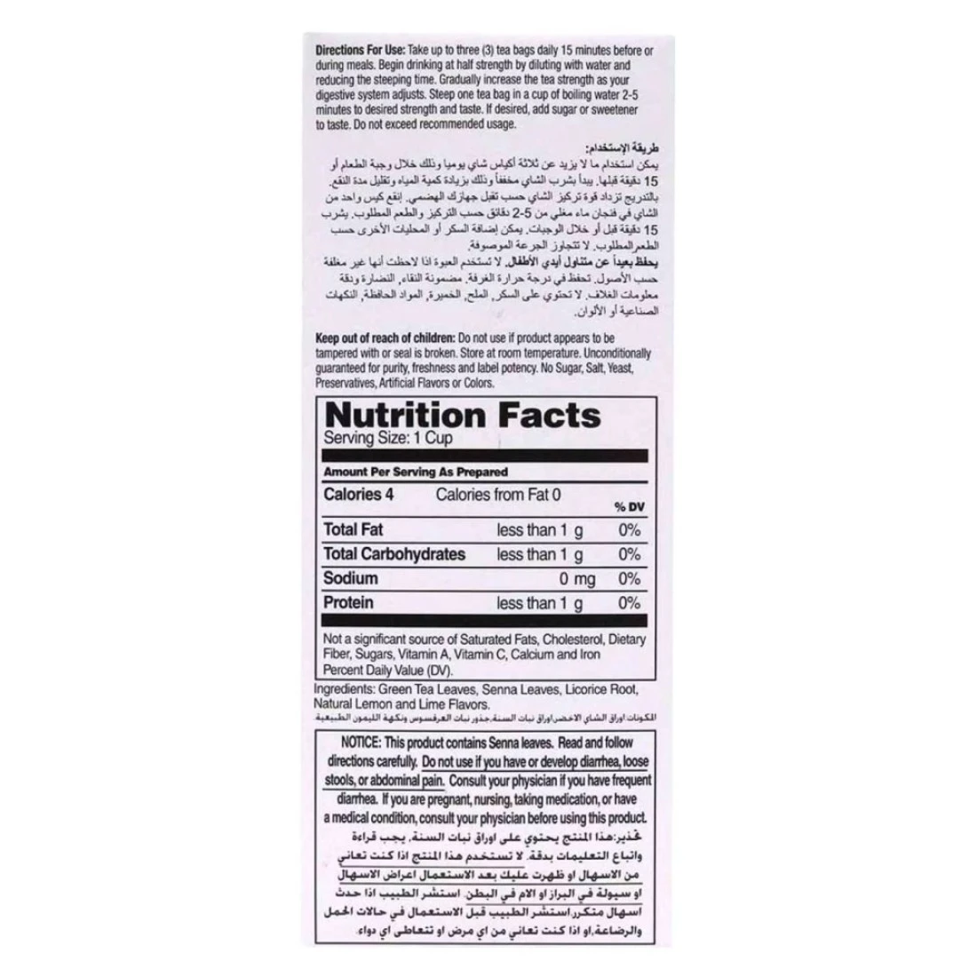 ingredients : Green Tea Leaves, Senna Leaves, Licorice Root, Natural Lemon and Lime Flavours.